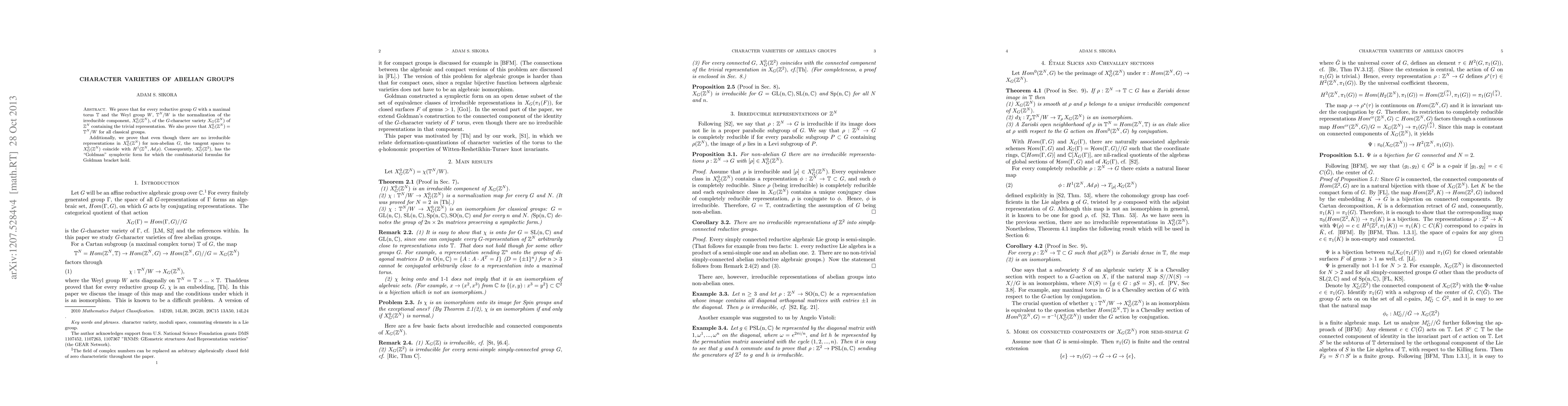 We prove that for every reductive group G with a maximal torus T and the Weyl group W there is a natural normalization map chi from T^N/W to an irreducible component of the G-character variety of Z^N. We prove that chi is an isomorphism for all classical groups. Additionally, we prove that even though there are no irreducible representations in the above mentioned irreducible component of the character variety for non-abelian G, the tangent spaces to it coincide with H^1(Z^N, Ad rho). Consequently, this irreducible component has the "Goldman" symplectic form for N=2, for which the combinatorial formulas for Goldman bracket hold.