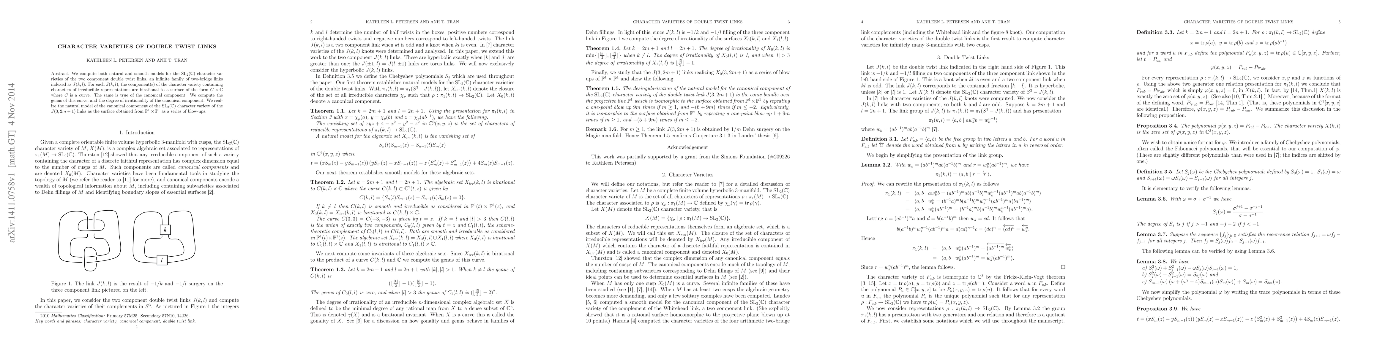This research computes the $SL_2(\mathbb C)$ character varieties of double twist links $J(k,l)$, showing that irreducible representations' components are birational to $C\times \mathbb C$ with $C$ being a computed genus curve. The study also determines the degree of irrationality of the canonical component and realizes its natural model via a series of blow-ups on $\mathbb{P}^1\times \mathbb{P}^1$.
