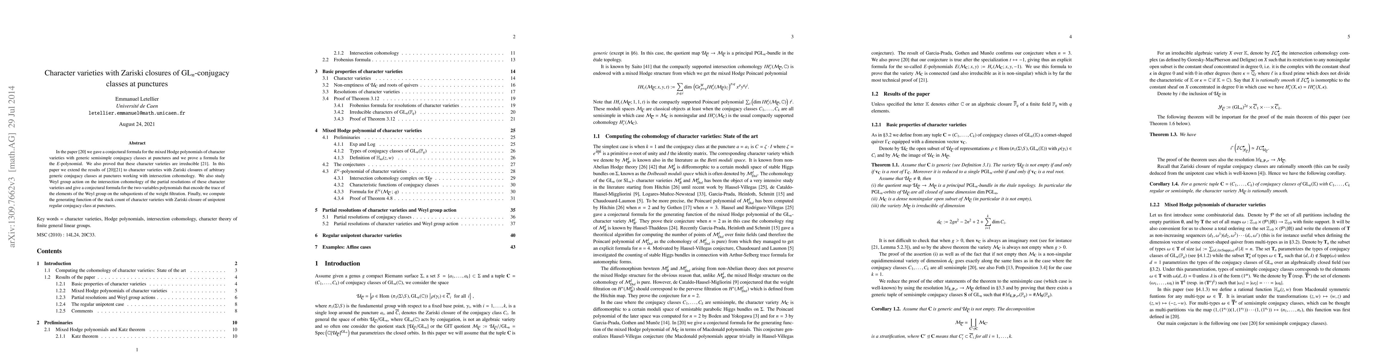 This paper extends previous results on mixed Hodge polynomials and E-polynomials for character varieties with generic semisimple conjugacy classes to include arbitrary generic conjugacy classes, employing intersection cohomology. It also investigates Weyl group actions on these varieties and proposes a conjecture for two-variable polynomials related to the trace of Weyl group elements. Additionally, it computes the generating function for character varieties with a unipotent regular conjugacy class.