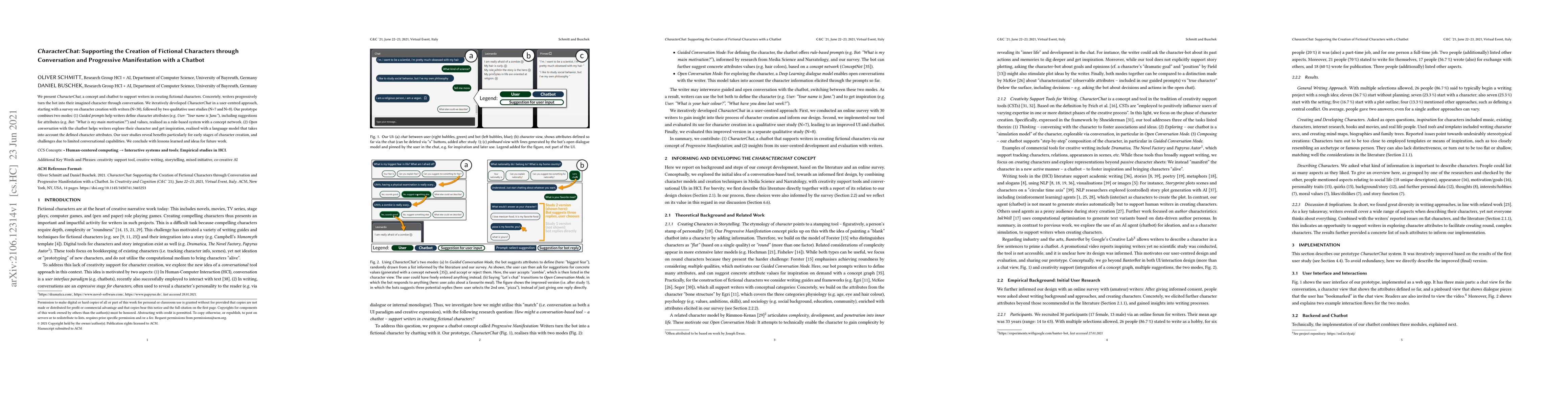 CharacterChat is a chatbot aiding writers in developing fictional characters through guided prompts and open conversations, showing benefits in early character creation but facing challenges in conversational depth. Future work could enhance its language model to better understand and reflect character attributes.