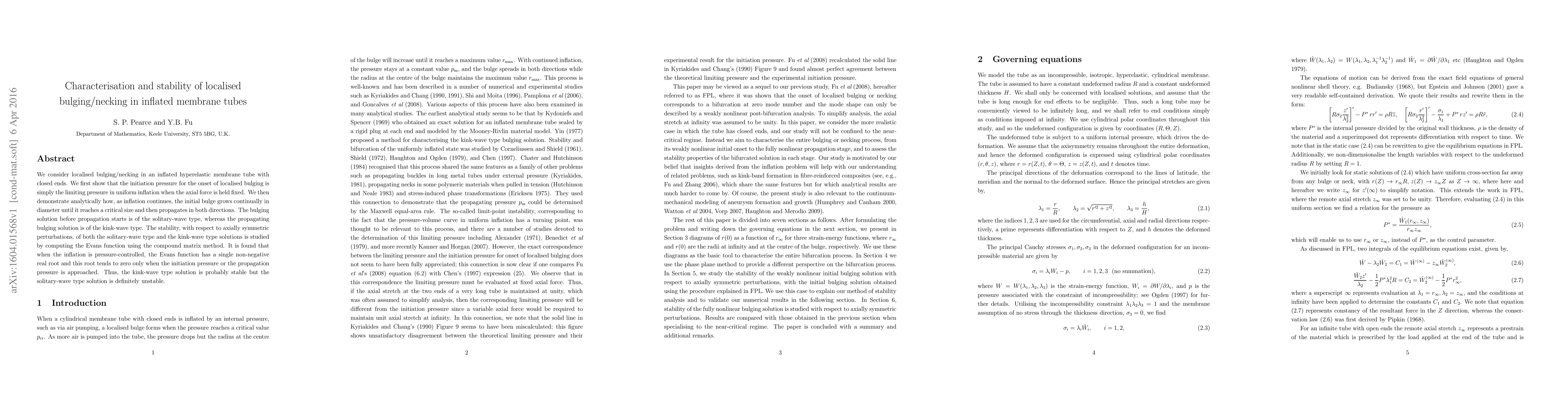 This paper characterizes the initiation and propagation of localised bulging in inflated hyperelastic membrane tubes, showing that the solitary-wave type solution is unstable while the kink-wave type solution is likely stable, as determined by the Evans function analysis.