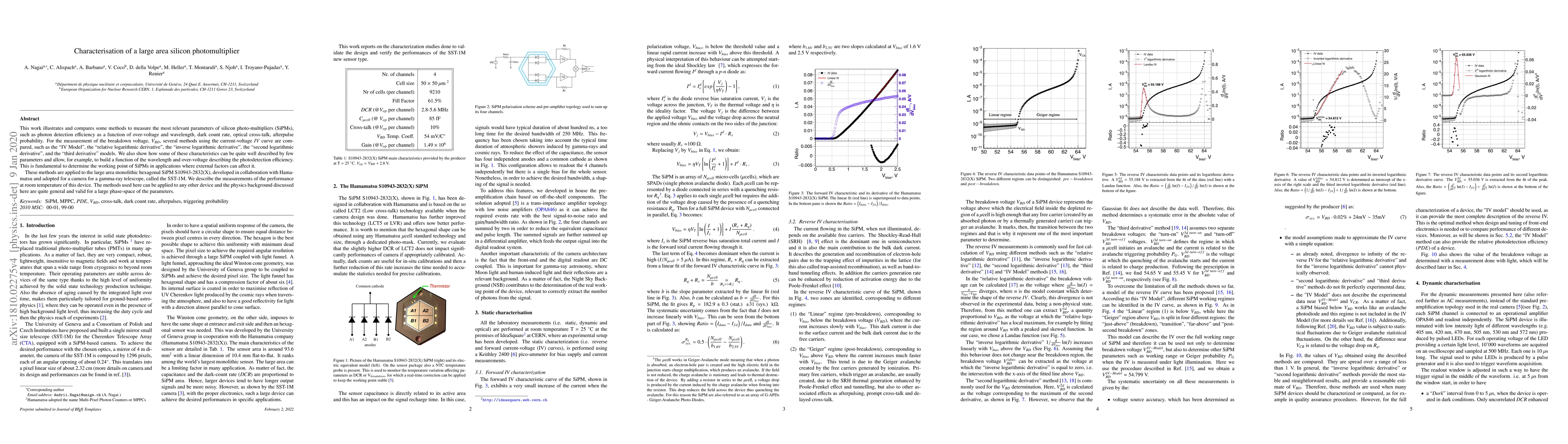 This work illustrates and compares some methods to measure the most relevant parameters of silicon photo-multipliers (\sipm{}s), such as photon detection efficiency as a function of over-voltage and wavelength, dark count rate, optical cross-talk, afterpulse probability. For the measurement of the breakdown voltage, $V_{BD}$, several methods using the current-voltage $IV$ curve are compared, such as the "IV Model", the "relative logarithmic derivative", the "inverse logarithmic derivative", the "second logarithmic derivative", and the "third derivative" models. We also show how some of these characteristics can be quite well described by few parameters and allow, for example, to build a function of the wavelength and over-voltage describing the photodetection efficiency. This is fundamental to determine the working point of SiPMs in applications where external factors can affect it. These methods are applied to the large area monolithic hexagonal SiPM S10943-2832(X), developed in collaboration with Hamamatsu and adopted for a camera for a gamma-ray telescope, called the SST-1M. We describe the measurements of the performance at room temperature of this device. The methods used here can be applied to any other device and the physics background discussed here are quite general and valid for a large phase-space of the parameters.
