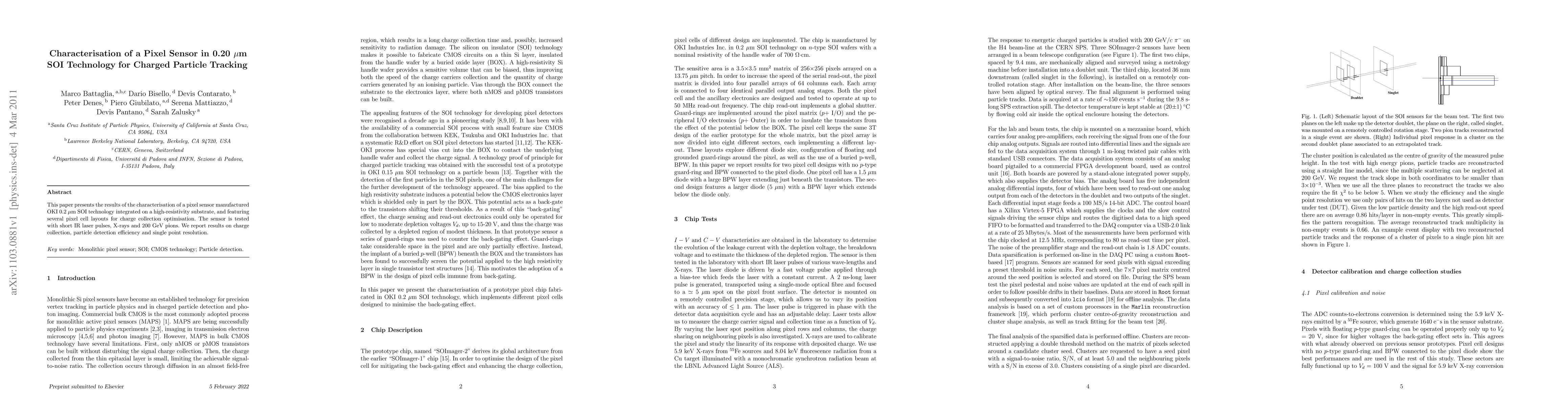 This paper characterizes a pixel sensor in 0.20 micron SOI technology for charged particle tracking, reporting performance metrics including charge collection, detection efficiency, and resolution using various particle sources. The sensor's pixel layouts are optimized for charge collection.