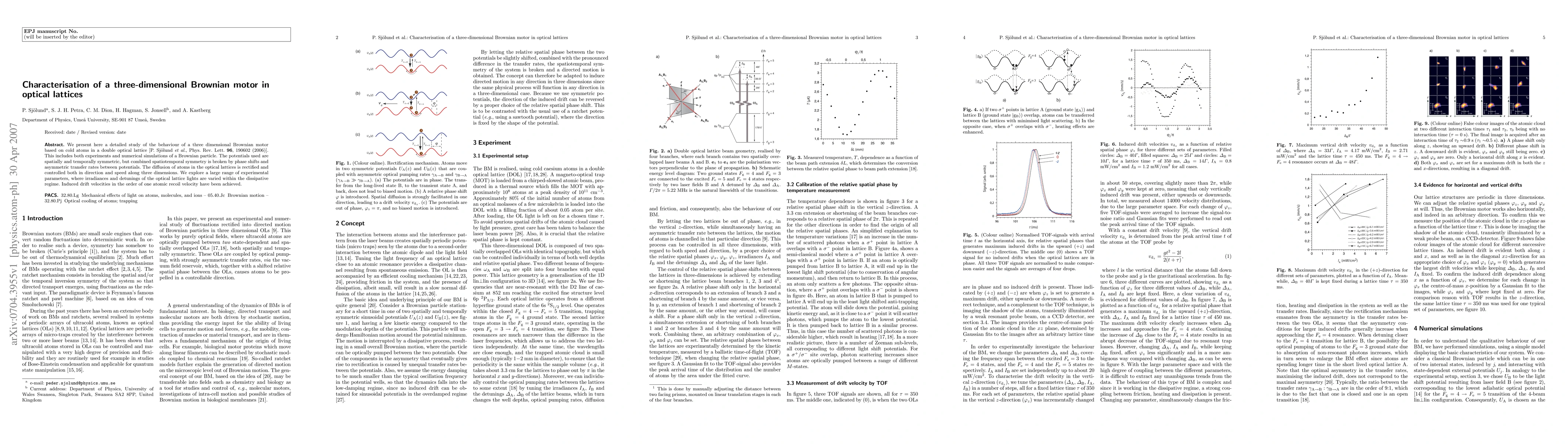 This paper investigates a three-dimensional Brownian motor utilizing cold atoms in a double optical lattice, combining experimental and numerical simulations. The study shows controlled, rectified diffusion of atoms with induced drift velocities up to one atomic recoil velocity, achieved through phase shifts and asymmetric transfer rates.