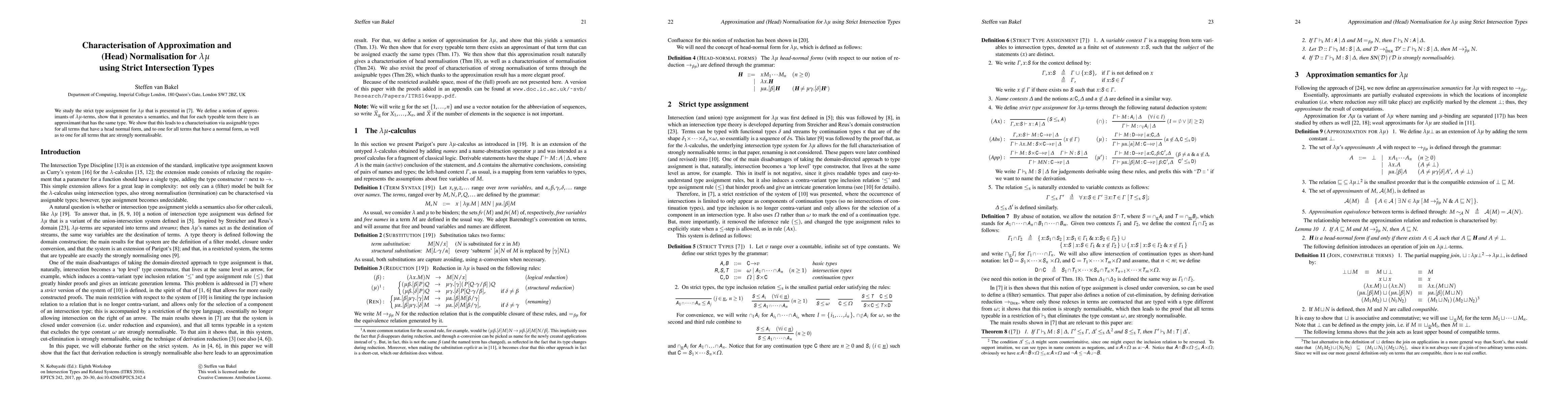 This paper investigates strict intersection types for lambda-mu calculus, defining approximants that generate a semantics. It demonstrates that these approximants correspond to head normal forms and normal forms, and characterises strongly normalisable terms via assignable types.