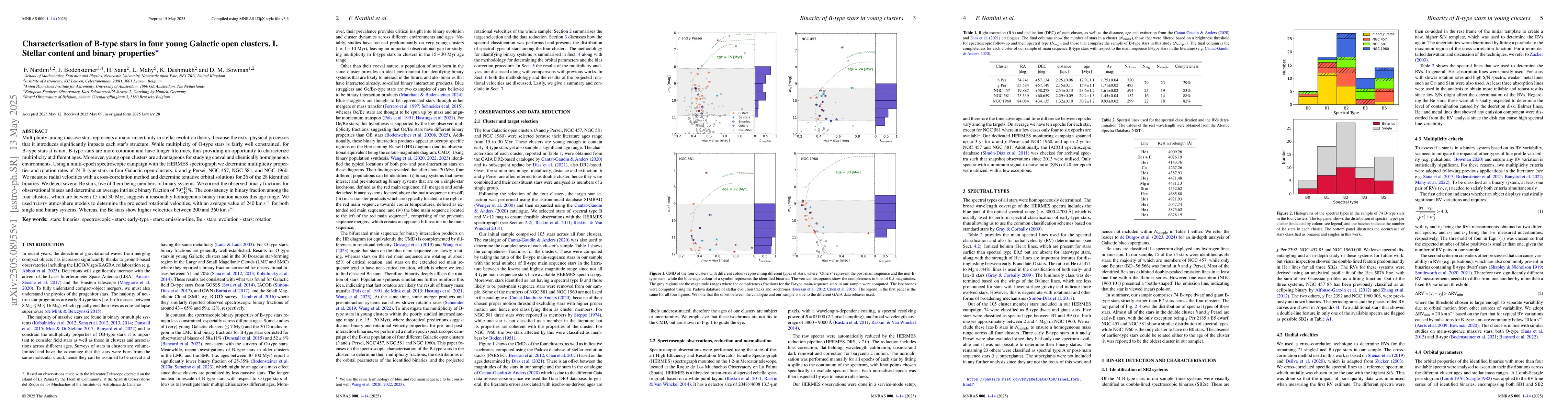 The research utilized a multi-epoch spectroscopic campaign with the HERMES spectrograph to determine multiplicity properties and rotation rates of B-type stars in four Galactic open clusters: h and χ Persei, NGC 457, NGC 581, and NGC 1960. Radial velocities were measured using a cross-correlation method, and tentative orbital solutions were determined for identified binaries.