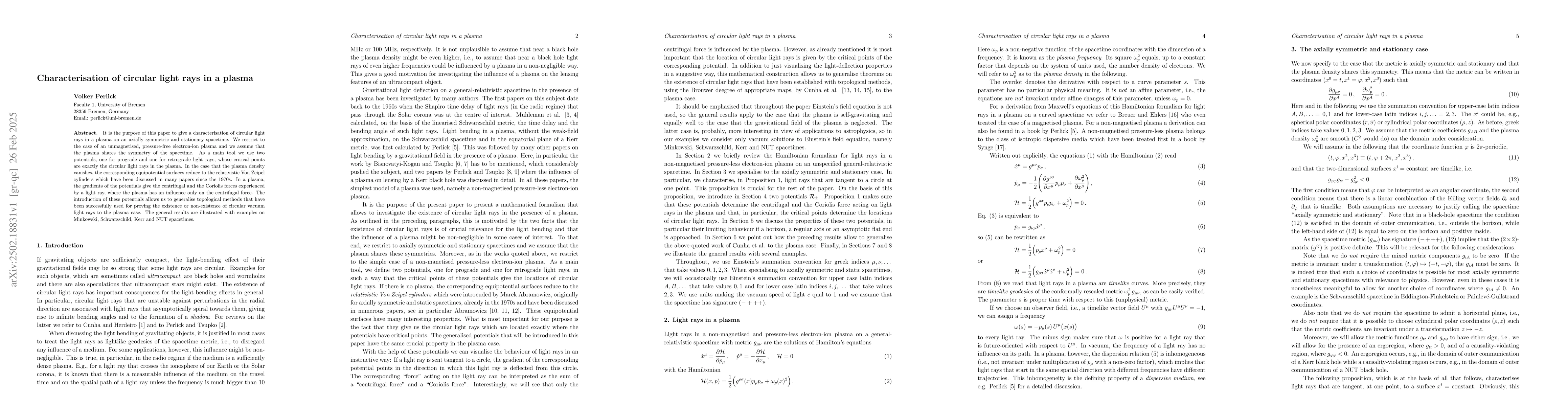 The paper characterizes circular light rays in a plasma within an axially symmetric and stationary spacetime, using two potentials for prograde and retrograde light rays. It generalizes topological methods for circular vacuum light rays to the plasma case.