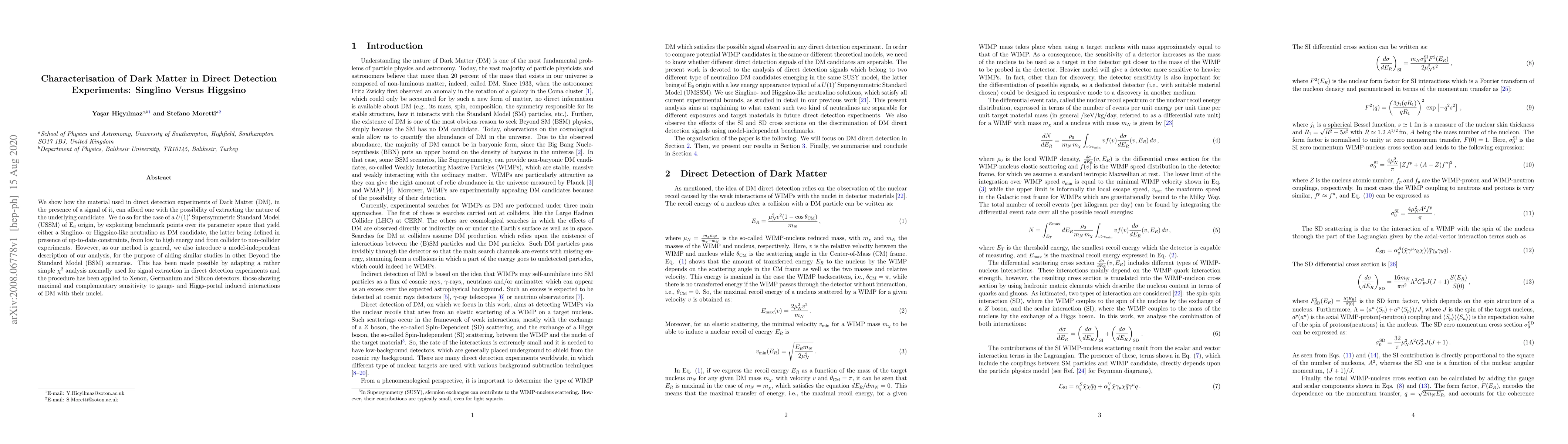 We show how the material used in direct detection experiments of Dark Matter (DM), in the presence of a signal of it, can afford one with the possibility of extracting the nature of the underlying candidate. We do so for the case of a $U(1)'$ Supersymmetric Standard Model (USSM) of E$_6$ origin, by exploiting benchmark points over its parameter space that yield either a Singlino- or Higgsino-like neutralino as DM candidate, the latter being defined in presence of up-to-date constraints, from low to high energy and from collider to non-collider experiments. However, as our method is general, we also introduce a model-independent description of our analysis, for the purpose of aiding similar studies in other Beyond the Standard Model (BSM) scenarios. This has been made possible by adapting a rather simple $\chi^2$ analysis normally used for signal extraction in direct detection experiments and the procedure has been applied to Xenon, Germanium and Silicon detectors, those showing maximal and complementary sensitivity to gauge- and Higgs-portal induced interactions of DM with their nuclei.