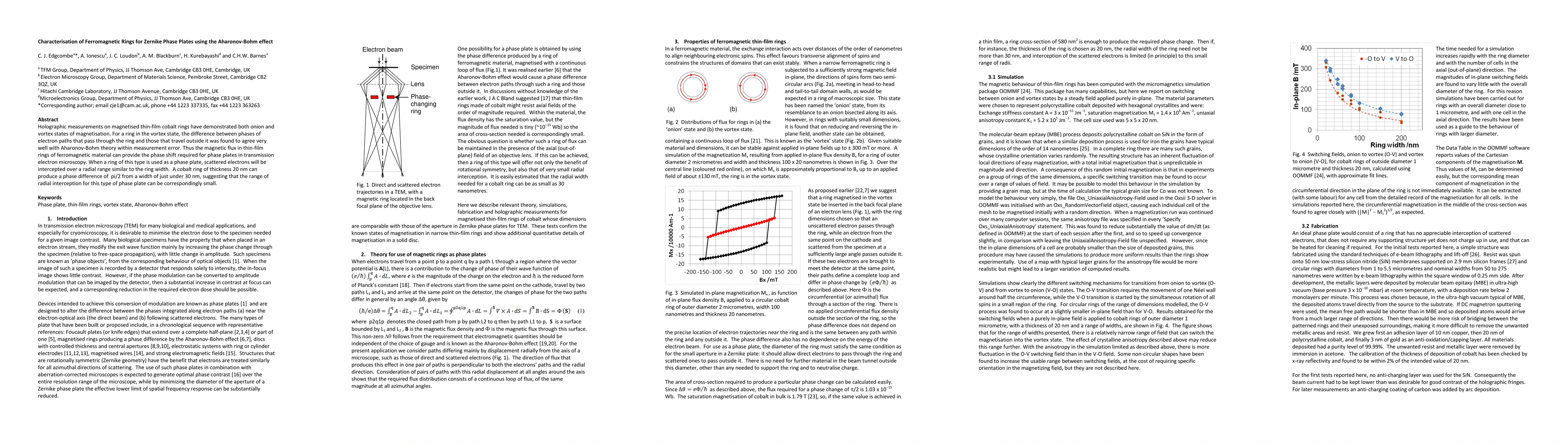 Holographic measurements on magnetised thin-film cobalt rings have demonstrated both onion and vortex states of magnetisation. For a ring in the vortex state, the difference between phases of electron paths that pass through the ring and those that travel outside it was found to agree very well with Aharonov-Bohm theory within measurement error. Thus the magnetic flux in thin-film rings of ferromagnetic material can provide the phase shift required for phase plates in transmission electron microscopy. When a ring of this type is used as a phase plate, scattered electrons will be intercepted over a radial range similar to the ring width. A cobalt ring of thickness 20 nm can produce a phase difference of pi/2 from a width of just under 30 nm, suggesting that the range of radial interception for this type of phase plate can be correspondingly small.