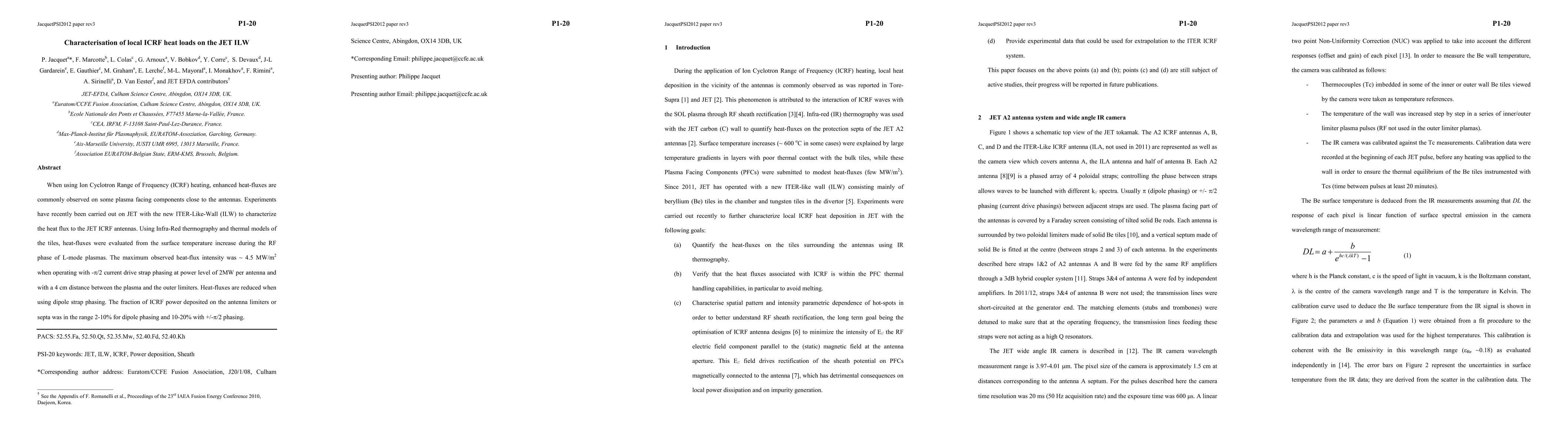 Researchers studied heat loads on JET ILW during ICRF heating, finding peak heat fluxes of ~ 4.5 MW/m2 with certain phasing configurations, which can reduce by using dipole strap phasing.