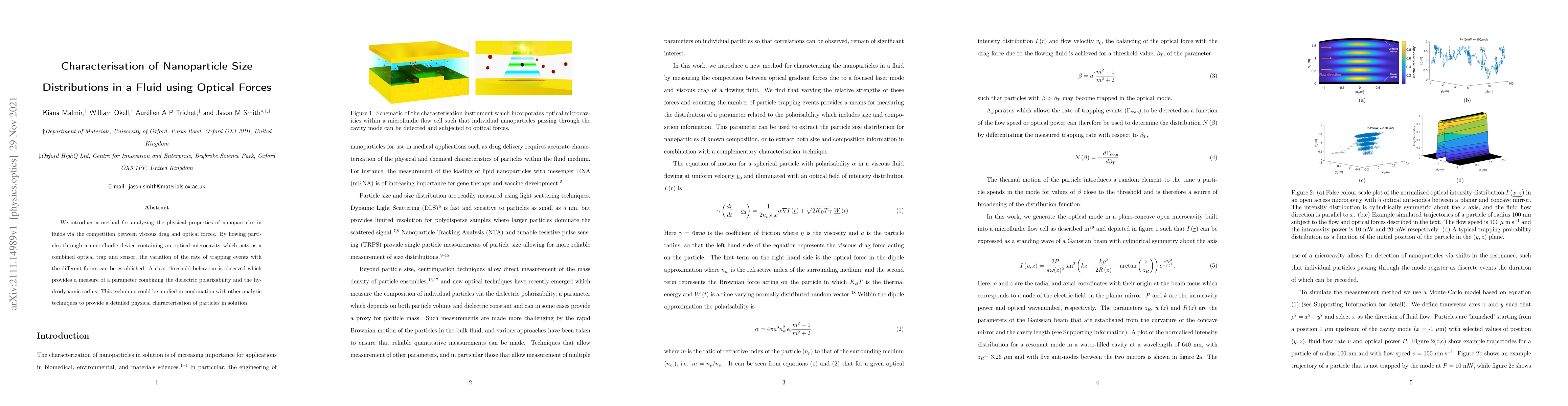 This paper presents a novel method for characterizing nanoparticle size distributions in fluid by analyzing the interplay between viscous drag and optical forces within a microfluidic device with an optical microcavity. The method reveals a threshold behavior that correlates to a combined parameter of dielectric polarizability and hydrodynamic radius, offering a new tool for detailed physical characterization of particles in solution.