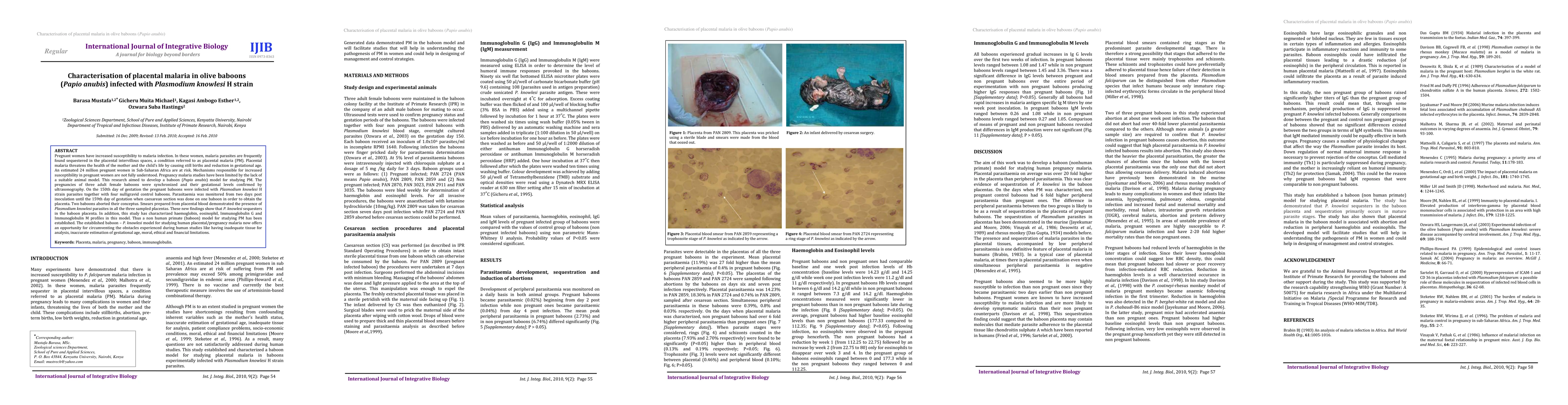 Pregnant women have increased susceptibility to malaria infection. In these women, malaria parasites are frequently found sequestered in the placental intervillous spaces, a condition referred to as placental malaria (PM). Placental malaria threatens the health of the mother and the child's life by causing still births and reduction in gestational age. An estimated 24 million pregnant women in Sub-Saharan Africa are at risk. Mechanisms responsible for increased susceptibility in pregnant women are not fully understood. Pregnancy malaria studies have been limited by the lack of a suitable animal model. This research aimed to develop a baboon (Papio anubis) model for studying PM. The pregnancies of three adult female baboons were synchronized and their gestational levels confirmed by ultrasonography. On the 150th day of gestation the pregnant baboons were infected with Plasmodium knowlesi H strain parasites together with four nulligravid control baboons. Parasitaemia was monitored from two days post inoculation until the 159th day of gestation when caesarean section was done on one baboon in order to obtain the placenta. Two baboons aborted their conceptus. Smears prepared from placental blood demonstrated the presence of Plasmodium knowlesi parasites in all the three sampled placentas. These new findings show that P. knowlesi sequesters in the baboon placenta. In addition, this study has characterized haemoglobin, eosinophil, Immunoglobulin G and Immunoglobulin M profiles in this model. Thus a non human primate (baboon) model for studying PM has been established. The established baboon - P. knowlesi model for studying human placental/pregnancy malaria now offers an opportunity for circumventing the obstacles experienced during human studies like having inadequate tissue for analysis, inaccurate estimation of gestational age, moral, ethical and financial limitations.