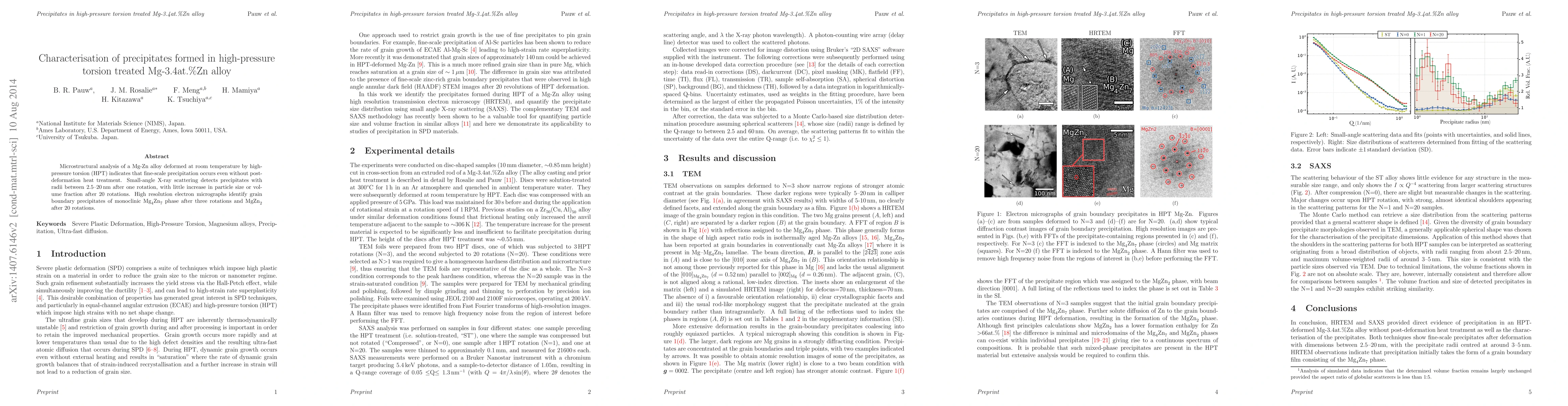 This study characterizes precipitates in Mg-3.4at.%Zn alloy processed by high-pressure torsion, revealing fine-scale precipitation of Mg$_4$Zn$_7$ and MgZn$_2$ phases without heat treatment. Small-angle X-ray scattering and electron microscopy show stable precipitate size and volume after extensive deformation.