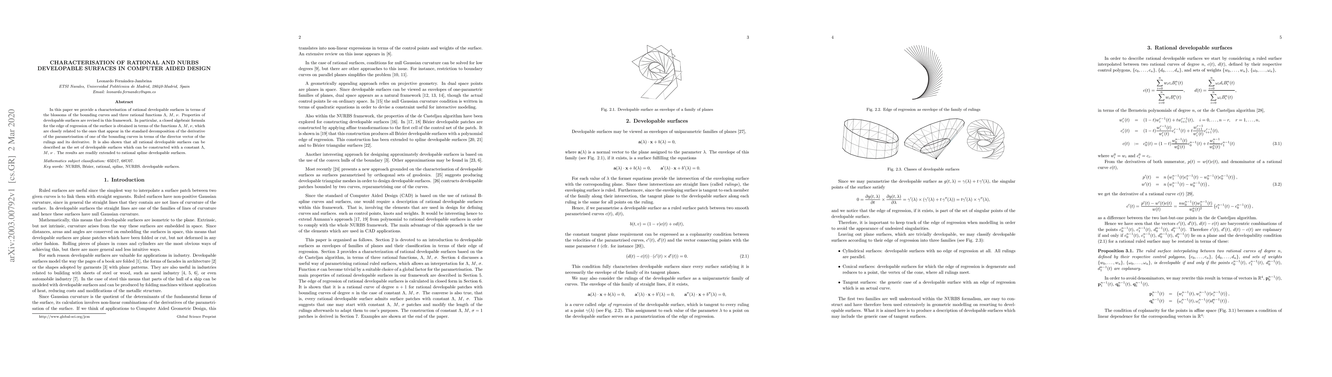 In this paper we provide a characterisation of rational developable surfaces in terms of the blossoms of the bounding curves and three rational functions $\Lambda$, $M$, $\nu$. Properties of developable surfaces are revised in this framework. In particular, a closed algebraic formula for the edge of regression of the surface is obtained in terms of the functions $\Lambda$, $M$, $\nu$, which are closely related to the ones that appear in the standard decomposition of the derivative of the parametrisation of one of the bounding curves in terms of the director vector of the rulings and its derivative. It is also shown that all rational developable surfaces can be described as the set of developable surfaces which can be constructed with a constant $\Lambda$, $M$, $\nu$ . The results are readily extended to rational spline developable surfaces.