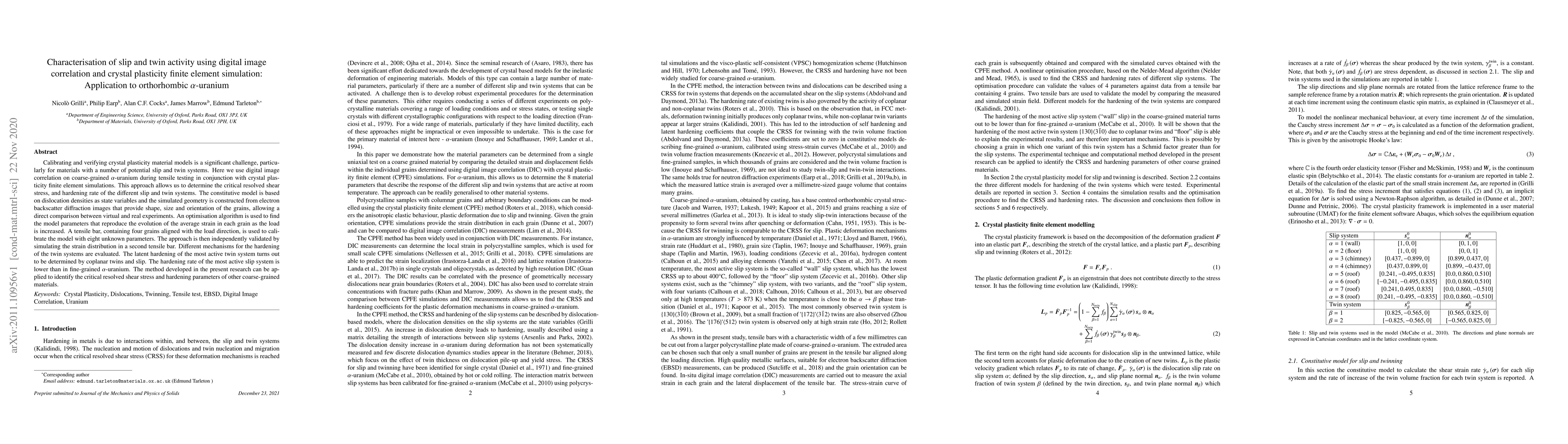 Calibrating and verifying crystal plasticity material models is a significant challenge, particularly for materials with a number of potential slip and twin systems. Here we use digital image correlation on coarse-grained $\alpha$-uranium during tensile testing in conjunction with crystal plasticity finite element simulations. This approach allows us to determine the critical resolved shear stress, and hardening rate of the different slip and twin systems. The constitutive model is based on dislocation densities as state variables and the simulated geometry is constructed from electron backscatter diffraction images that provide shape, size and orientation of the grains, allowing a direct comparison between virtual and real experiments. An optimisation algorithm is used to find the model parameters that reproduce the evolution of the average strain in each grain as the load is increased. A tensile bar, containing four grains aligned with the load direction, is used to calibrate the model with eight unknown parameters. The approach is then independently validated by simulating the strain distribution in a second tensile bar. Different mechanisms for the hardening of the twin systems are evaluated. The latent hardening of the most active twin system turns out to be determined by coplanar twins and slip. The hardening rate of the most active slip system is lower than in fine-grained $\alpha$-uranium. The method developed in the present research can be applied to identify the critical resolved shear stress and hardening parameters of other coarse-grained materials.