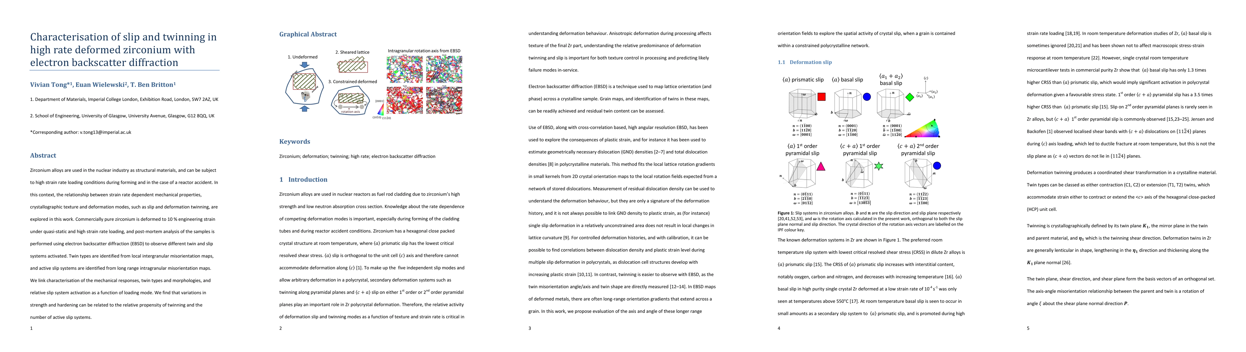 This study investigates the deformation mechanisms of zirconium under different strain rates using electron backscatter diffraction (EBSD) to characterize slip and twinning. The findings reveal that the mechanical properties and deformation behavior are strongly influenced by the activation of twinning and slip systems, with higher strain rates favoring twinning over slip.