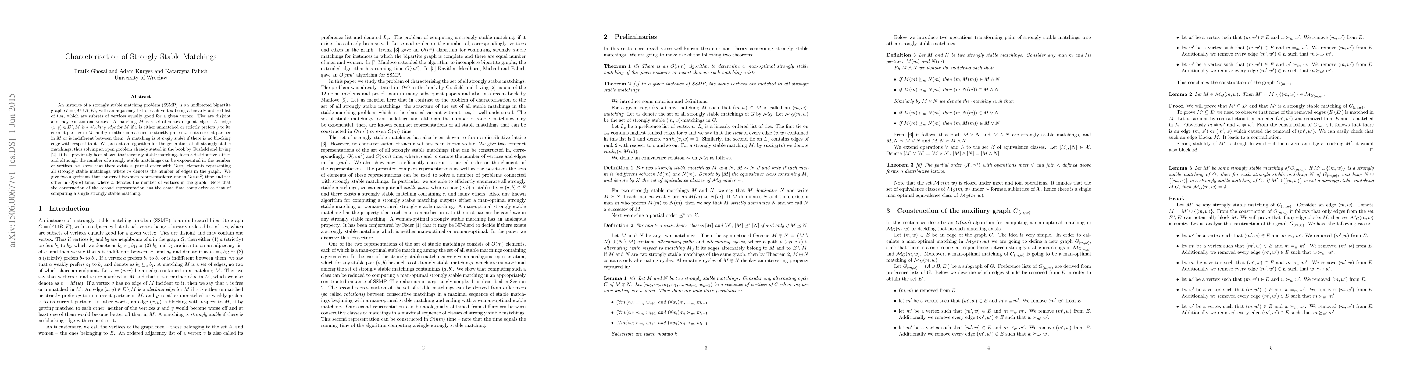 The paper presents an algorithm for generating all strongly stable matchings in a strongly stable matching problem (SSMP), characterizing them through a distributive lattice. It introduces two algorithms for constructing partial order representations of strongly stable matchings, one in O(nm^2) time and another in O(nm) time, addressing an open problem posed by Gusfield and Irving.