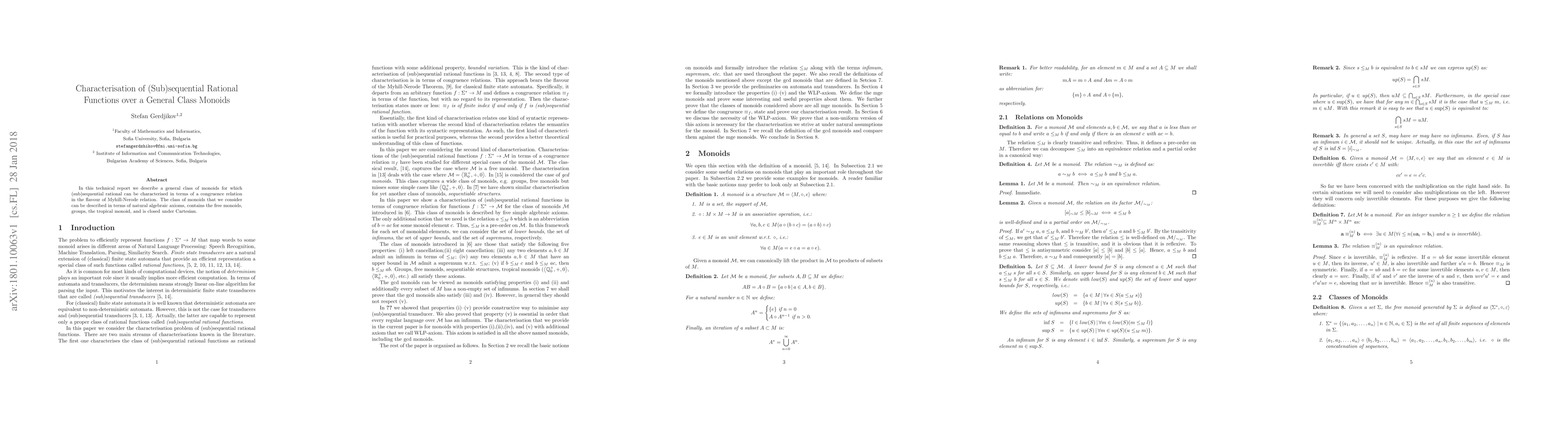 In this technical report we describe a general class of monoids for which (sub)sequential rational can be characterised in terms of a congruence relation in the flavour of Myhill-Nerode relation. The class of monoids that we consider can be described in terms of natural algebraic axioms, contains the free monoids, groups, the tropical monoid, and is closed under Cartesian.