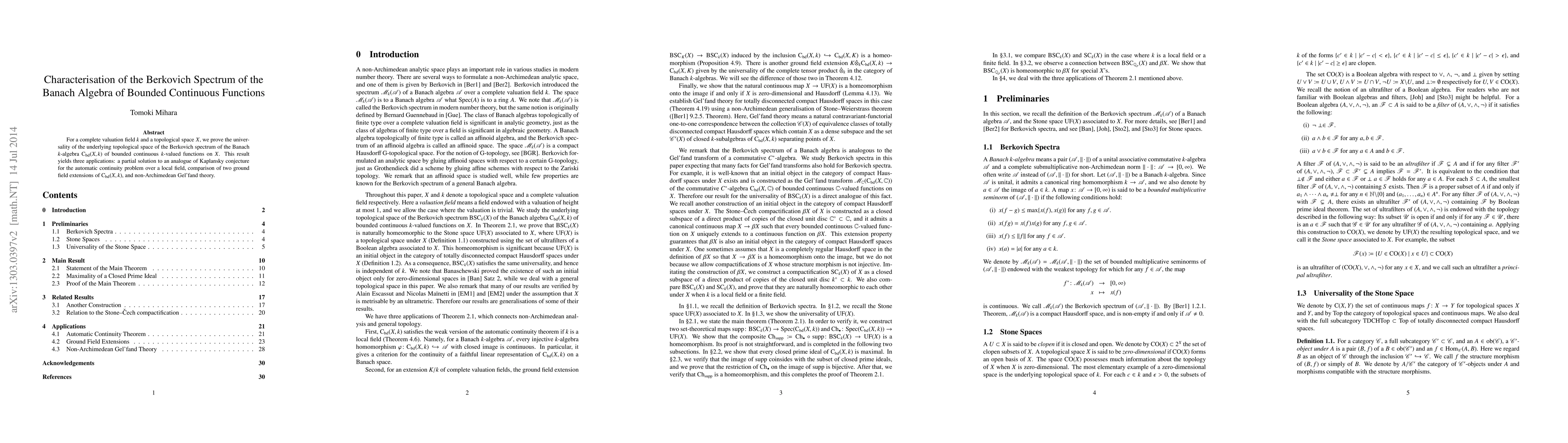 For a complete valuation field k and a topological space X, we prove the universality of the underlying topological space of the Berkovich spectrum of the Banach k-algebra Cbd(X,k) of bounded continuous k-valued functions on X. This result yields three applications: a partial solution to an analogue of Kaplansky conjecture for the automatic continuity problem over a local field, comparison of two ground field extensions of Cbd(X,k), and non-Archimedean Gel'fand theory.