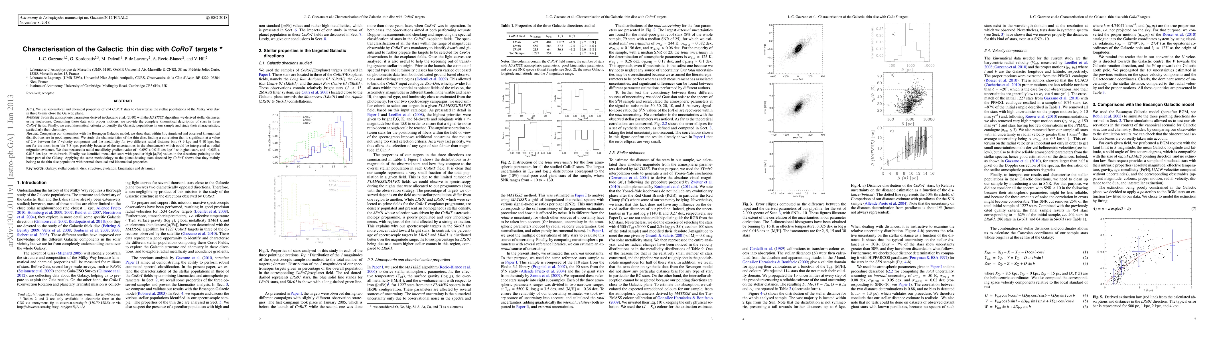 We use kinematical and chemical properties of 754 Corot stars to characterise the stellar populations of the Milky Way disc in three beams close the Galactic plane. From the atmospheric parameters derived in Gazzano et al. (2010) with the Matisse algorithm, we derived stellar distances using isochrones. Combining these data with proper motions, we provide the complete kinematical description of stars in three Corot fields. Finally, we used kinematical criteria to identify the Galactic populations in our sample and study their characteristics, particularly their chemistry. Comparing our kinematics with the Besancon Galactic model, we show that, within 3-sigma, simulated and observed kinematical distributions are in good agreement. We study the characteristics of the thin disc, finding a correlation that is significant at a value of 2-sigma between the V-velocity component and the metallicity for two different radial distance bins (8-9kpc and 9-10kpc; but not for the most inner bin 7-8kpc, probably because of the uncertainties in the abundances) which could be interpreted as radial migration evidence. We also measured a radial metallicity gradient value of -0.097+/-0.015dex/kpc with giant stars, and -0.053+/-0.015dex/kpc with dwarfs. Finally, we identified metal-rich stars with peculiar high [alpha/Fe] values in the directions pointing to the inner part of the Galaxy. Applying the same methodology to the planet-hosting stars detected by Corot shows that they mainly belong to the thin disc population with normal chemical and kinematical properties.