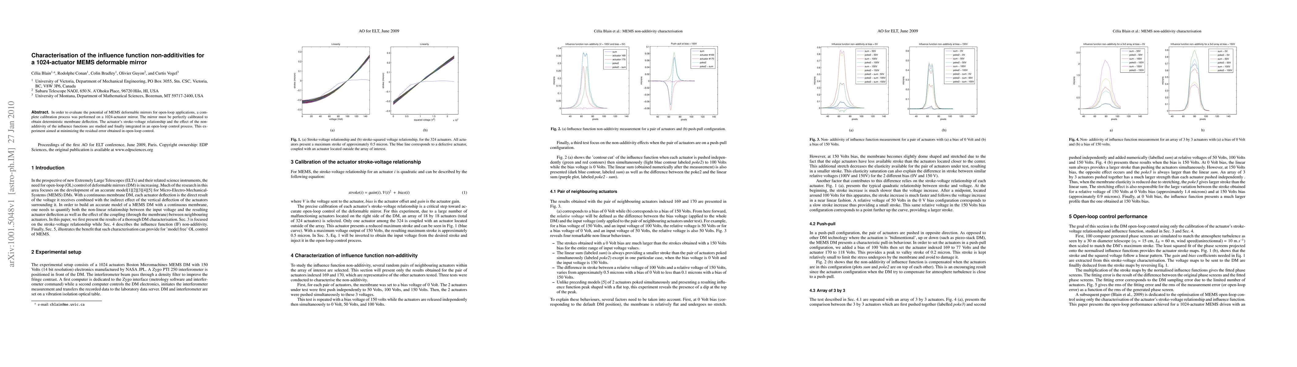 This paper characterizes the non-additive influence functions of a 1024-actuator MEMS deformable mirror, aiming to calibrate it for open-loop applications. The study focuses on the actuator's stroke-voltage relationship and the non-additivity effects, integrating these findings into an open-loop control process to minimize residual errors.