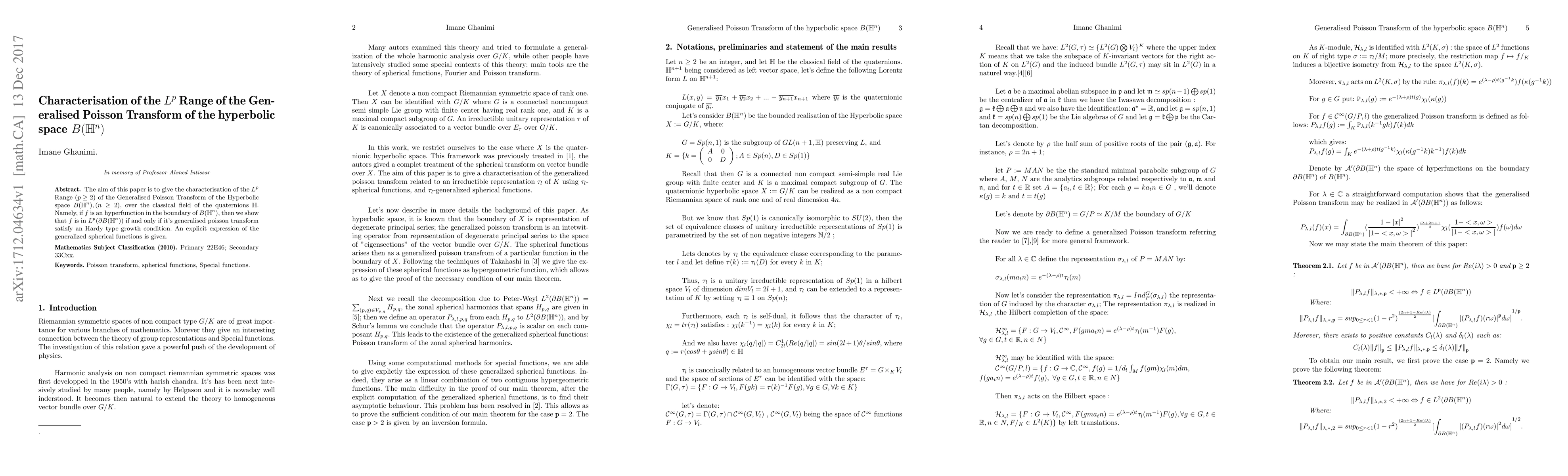 The aim of this paper is to give the characterisation of the L p Range (p $\ge$ 2) of the Generalised Poisson Transform of the Hyperbolic space B(H n), (n $\ge$ 2), over the classical field of the quaternions H. Namely, if f is an hyperfunction in the boundary of B(H n), then we show that f is in L p ($\partial$B(H n)) if and only if it's generalised poisson transform satisfy an Hardy type growth condition. An explicit expression of the generalized spherical functions is given. Mathematics Subject Classification (2010). Primary 22E46; Secondary 33Cxx.