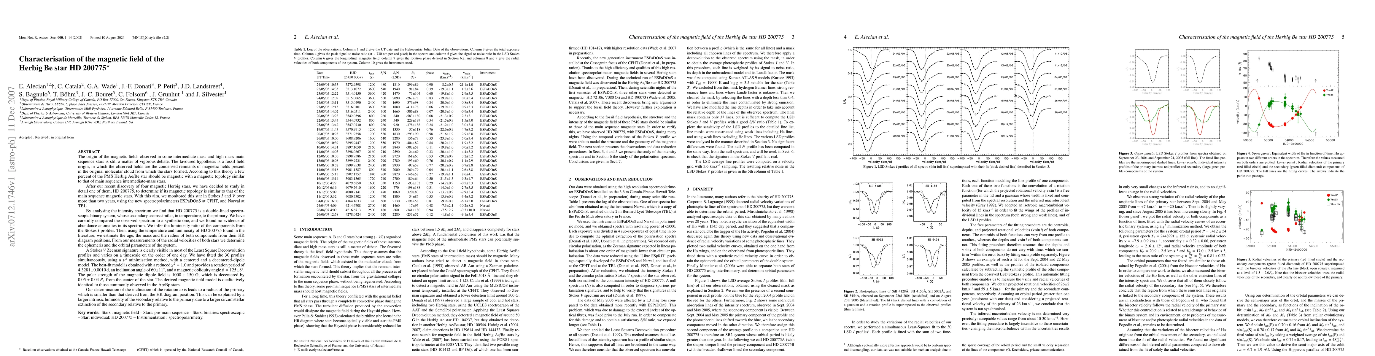 After our recent discovery of four magnetic Herbig stars, we have decided to study in detail one of them, HD 200775, to determine if its magnetic topology is similar to that of the main sequence magnetic stars. With this aim, we monitored this star in Stokes I and V over more than two years, using the new spectropolarimeters ESPaDOnS at CFHT, and Narval at TBL. Using our data, we find that HD 200775 is a double-lined spectroscopic binary system, whose secondary seems similar, in temperature, to the primary. We determine the luminosity ratio of the system, and using the luminosity of the system found in literature, we derive the luminosity of both stars. From our measurements of the radial velocities of both stars we determine the ephemeris and the orbital parameters of the system. We have fitted 30 Stokes V profiles simultaneously, using a chi2 minimisation method, with a decentered-dipole model. The best-fit model provides a rotation period of 4.3281 d an inclination angle of 60 degrees, and a magnetic obliquity angle of 125 degrees. The polar strength of the magnetic dipole field is 1000 G, which is decentered by 0.05 R* from the center of the star. The derived magnetic field model is qualitatively identical to those commonly observed in the Ap/Bp stars, which bring strong argument in favour of the fossil field hypothesis, to explain the origin of the magnetic fields in the main sequence Ap/Bp stars. Our determination of the inclination of the rotation axis leads to a radius of the primary which is smaller than that derived from the HR diagram position. This can be explained by a larger intrinsic luminosity of the secondary relative to the primary, due to a larger circumstellar extinction of the secondary relative to the primary.
