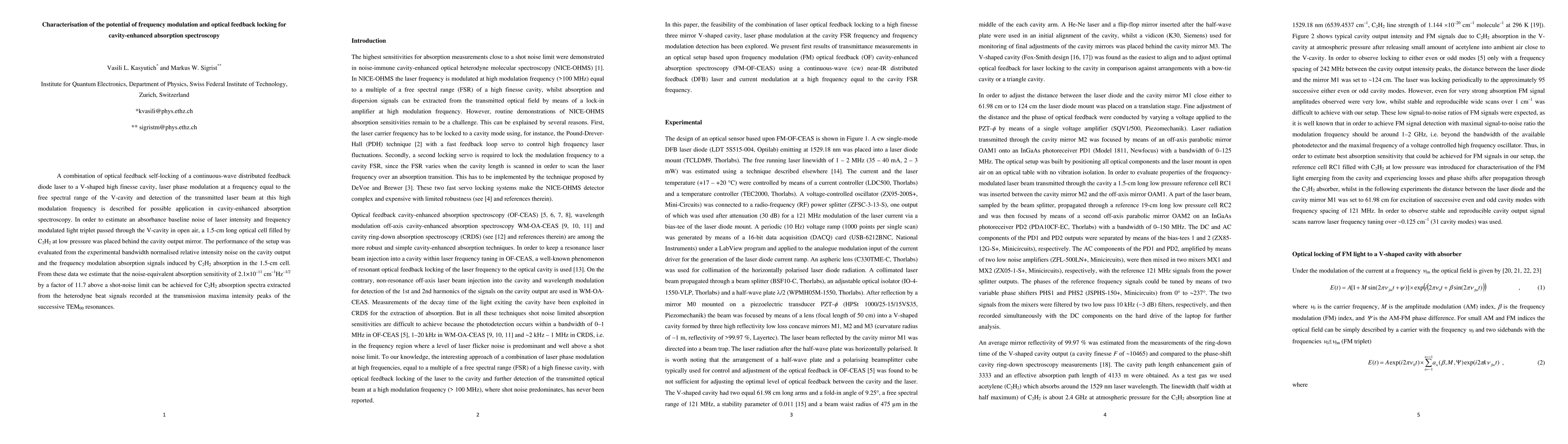 This paper explores the use of optical feedback locking and frequency modulation for cavity-enhanced absorption spectroscopy, demonstrating a setup that achieves a noise-equivalent absorption sensitivity of 2.1*10^-11 cm^-1 Hz^-1/2, significantly above the shot-noise limit, for C2H2 absorption spectra.