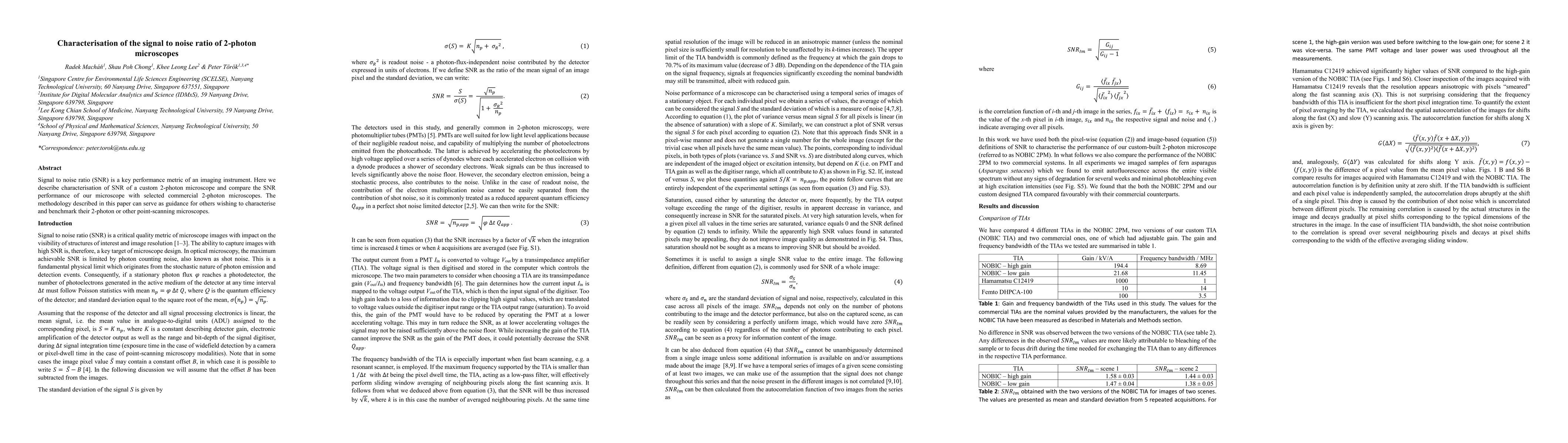 Signal to noise ratio (SNR) is a key performance metric of an imaging instrument. Here we describe characterisation of SNR of a custom 2-photon microscope and compare the SNR performance of our microscope with selected commercial 2-photon microscopes. The methodology described in this paper can serve as guidance for others wishing to characterise and benchmark their 2-photon or other point-scanning microscopes.