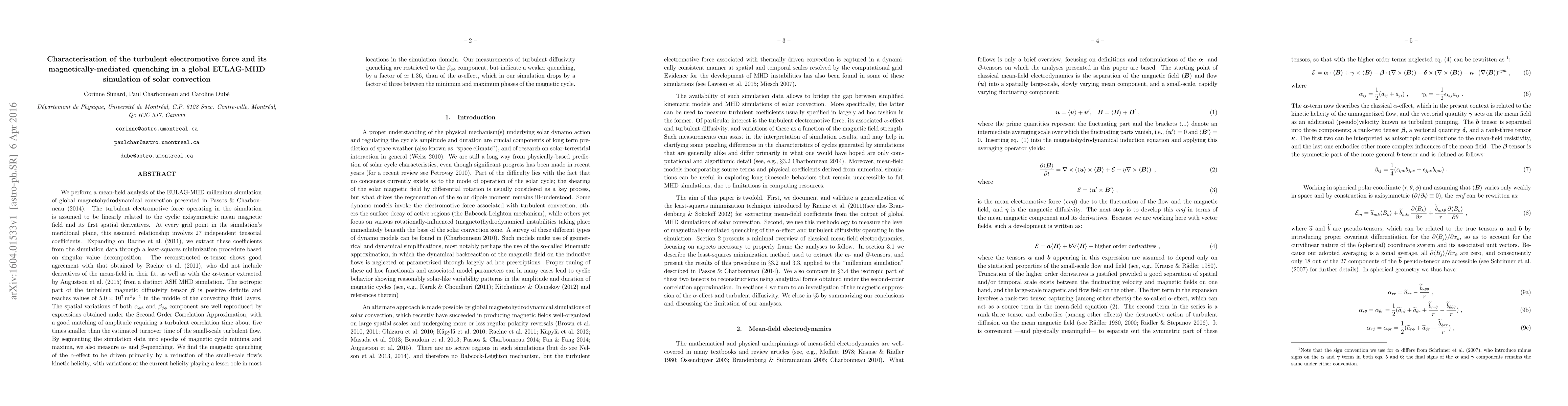 This paper characterizes the turbulent electromotive force in a global EULAG-MHD simulation of solar convection, finding a linear relationship between it and the mean magnetic field. The magnetic quenching of the alpha-effect is primarily due to reduced kinetic helicity, with weaker quenching observed in turbulent diffusivity.