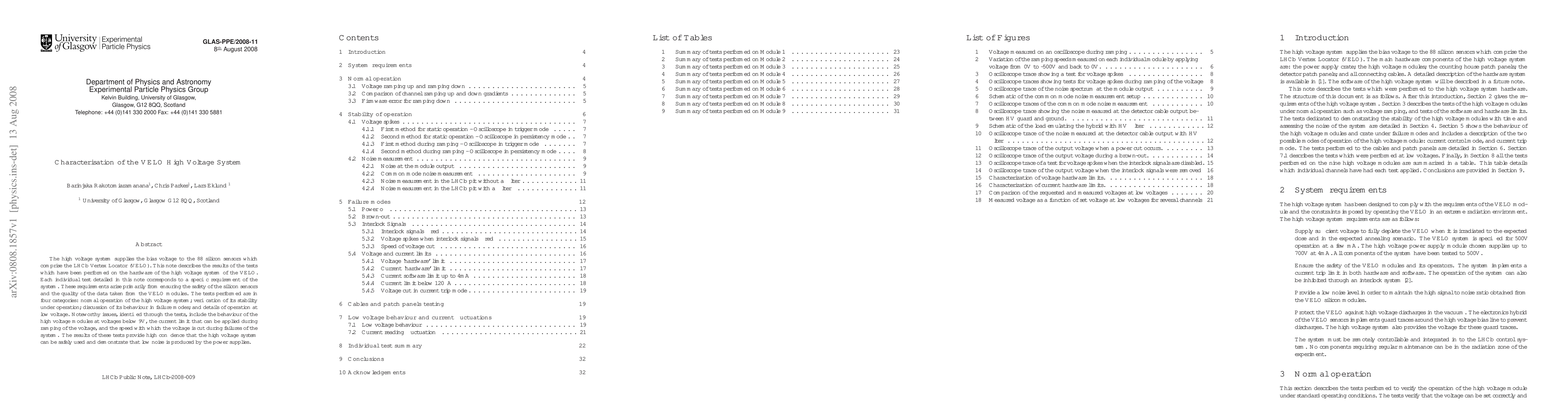 The VELO High Voltage System was tested for its safety and performance, with notable issues identified at low voltages and during failures, but results showed high confidence in safe operation and minimal noise.