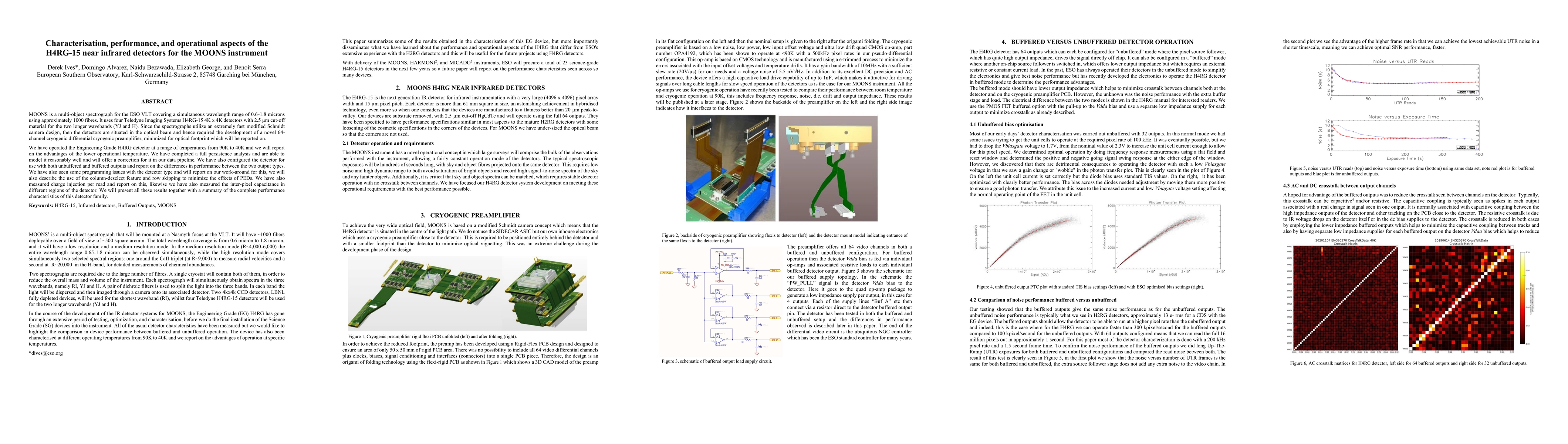 MOONS is a multi-object spectrograph for the ESO VLT covering a simultaneous wavelength range of 0.6-1.8 microns using approximately 1000 fibres. It uses four Teledyne Imaging Systems H4RG-15 4K x 4K detectors with 2.5 $\mu$m cut-off material for the two longer wavebands (YJ and H). Since the spectrographs utilize an extremely fast modified Schmidt camera design, then the detectors are situated in the optical beam and hence required the development of a novel 64- channel cryogenic differential cryogenic preamplifier, minimized for optical footprint which will be reported on. We have operated the Engineering Grade H4RG detector at a range of temperatures from 90K to 40K and we will report on the advantages of the lower operational temperature. We have completed a full persistence analysis and are able to model it reasonably well and will offer a correction for it in our data pipeline. We have also configured the detector for use with both unbuffered and buffered outputs and report on the differences in performance between the two output types. We have also seen some programming issues with the detector type and will report on our work-around for this, we will also describe the use of the column-deselect feature and row skipping to minimize the effects of PEDs. We have also measured charge injection per read and report on this, likewise we have also measured the inter-pixel capacitance in different regions of the detector. We will present all these results together with a summary of the complete performance characteristics of this detector family.