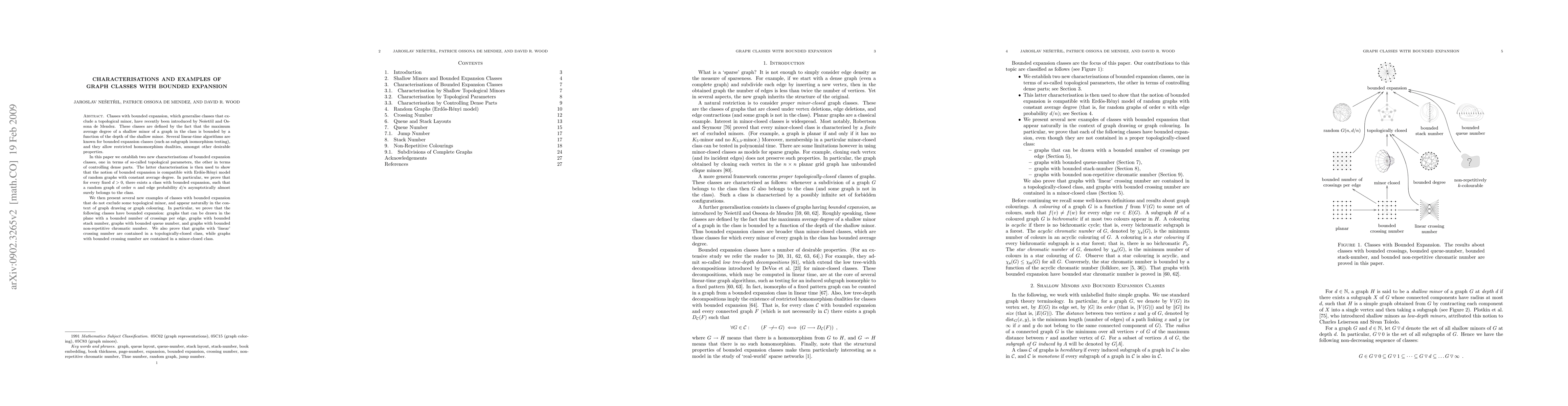 Classes with bounded expansion, which generalise classes that exclude a topological minor, have recently been introduced by Ne\v{s}et\v{r}il and Ossona de Mendez. These classes are defined by the fact that the maximum average degree of a shallow minor of a graph in the class is bounded by a function of the depth of the shallow minor. Several linear-time algorithms are known for bounded expansion classes (such as subgraph isomorphism testing), and they allow restricted homomorphism dualities, amongst other desirable properties. In this paper we establish two new characterisations of bounded expansion classes, one in terms of so-called topological parameters, the other in terms of controlling dense parts. The latter characterisation is then used to show that the notion of bounded expansion is compatible with Erd\"os-R\'enyi model of random graphs with constant average degree. In particular, we prove that for every fixed $d>0$, there exists a class with bounded expansion, such that a random graph of order $n$ and edge probability $d/n$ asymptotically almost surely belongs to the class. We then present several new examples of classes with bounded expansion that do not exclude some topological minor, and appear naturally in the context of graph drawing or graph colouring. In particular, we prove that the following classes have bounded expansion: graphs that can be drawn in the plane with a bounded number of crossings per edge, graphs with bounded stack number, graphs with bounded queue number, and graphs with bounded non-repetitive chromatic number. We also prove that graphs with `linear' crossing number are contained in a topologically-closed class, while graphs with bounded crossing number are contained in a minor-closed class.