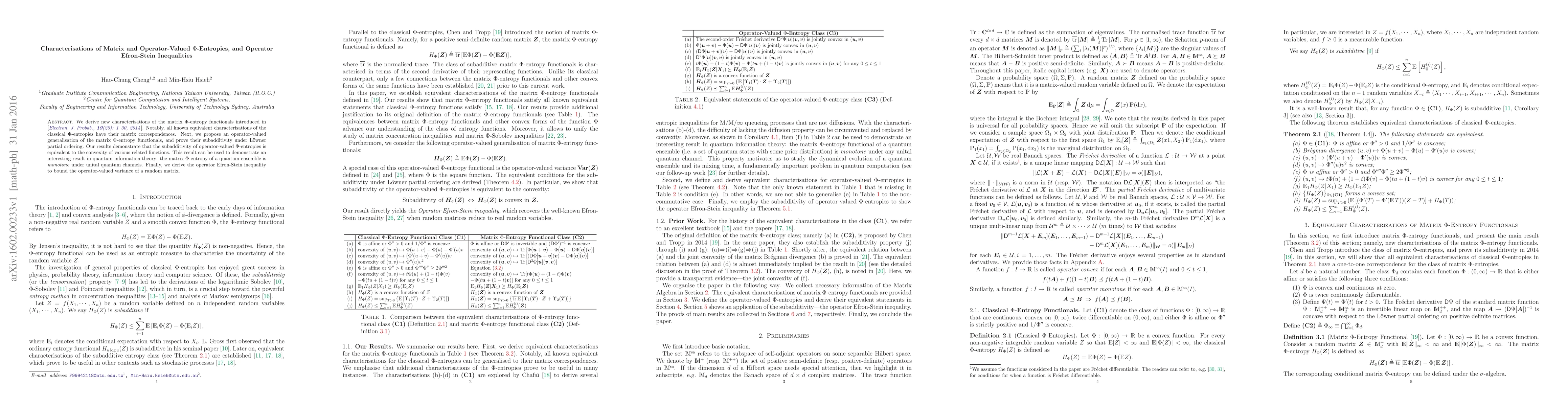 This paper provides new characterisations of matrix $\Phi$-entropies and extends them to operator-valued versions, proving their subadditivity. It also establishes an operator Efron-Stein inequality for bounding operator-valued variance, with applications to quantum information theory.