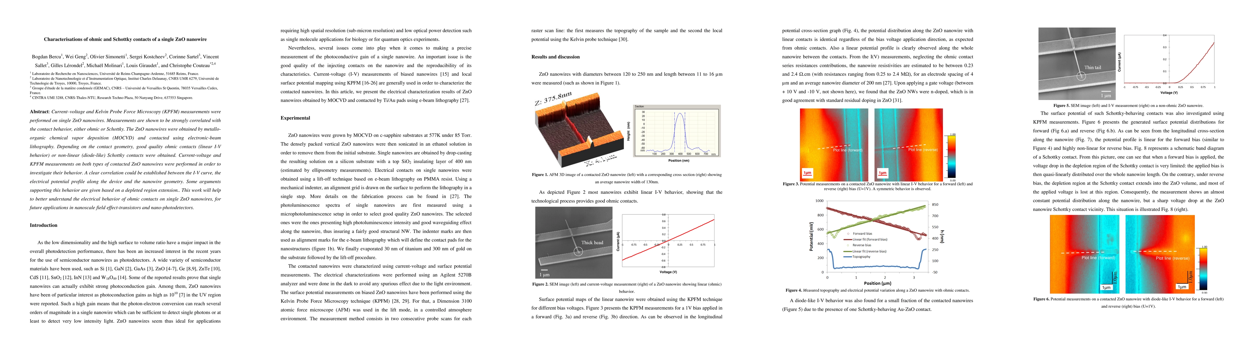 This paper characterizes ohmic and Schottky contacts in ZnO nanowires using current-voltage and KPFM measurements. It demonstrates that contact geometry influences whether the nanowire exhibits ohmic (linear I-V behavior) or Schottky (diode-like) behavior, providing insights for future nanoscale electronic devices.
