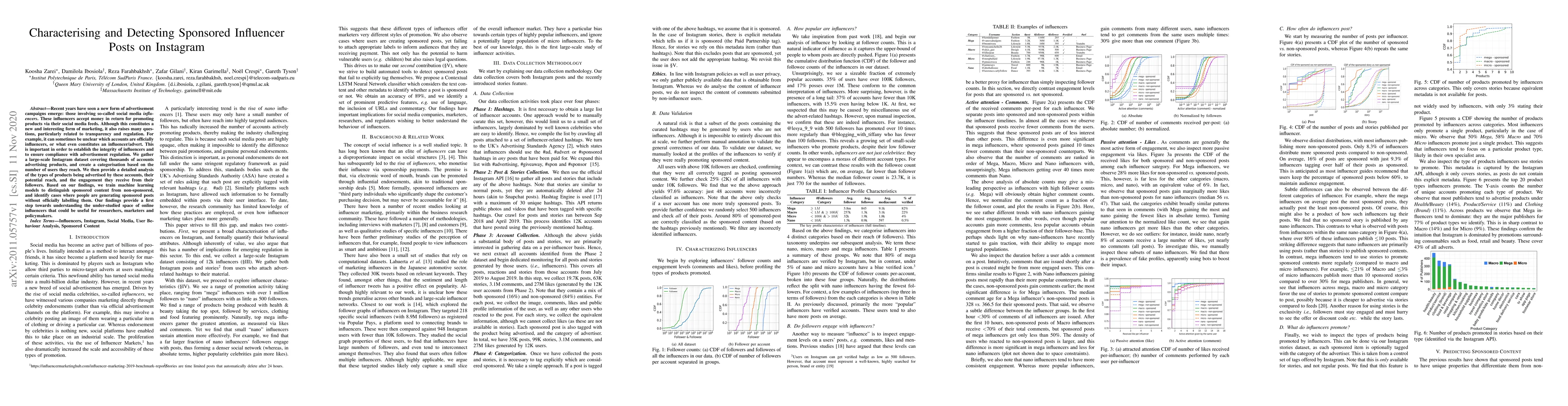This paper characterizes and detects sponsored influencer posts on Instagram by analyzing a large dataset to categorize accounts based on reach and engagement. It trains machine learning models to distinguish sponsored content, aiming to enhance transparency and compliance with advertisement regulations.
