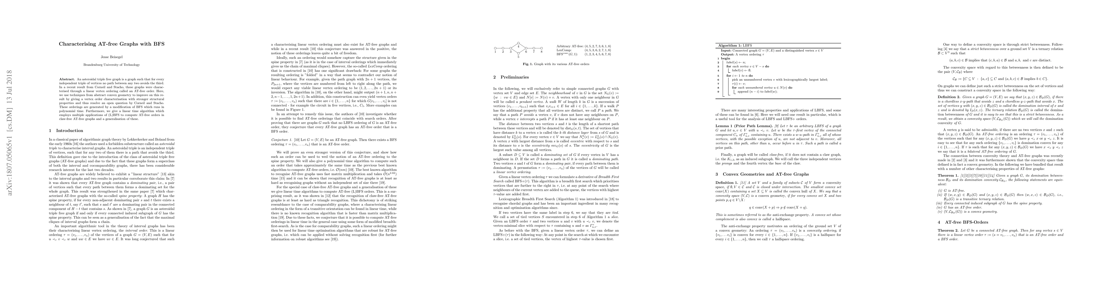 An asteroidal triple free graph is a graph such that for every independent triple of vertices no path between any two avoids the third. In a recent result from Corneil and Stacho, these graphs were characterised through a linear vertex ordering called an AT-free order. Here, we use techniques from abstract convex geometry to improve on this result by giving a vertex order characterisation with stronger structural properties and thus resolve an open question by Corneil and Stacho. These orderings are generated by a modification of BFS which runs in polynomial time. Furthermore, we give a linear time algorithm which employs multiple applications of (L)BFS to compute AT-free orders in claw-free AT-free graphs and a generalisation of these.