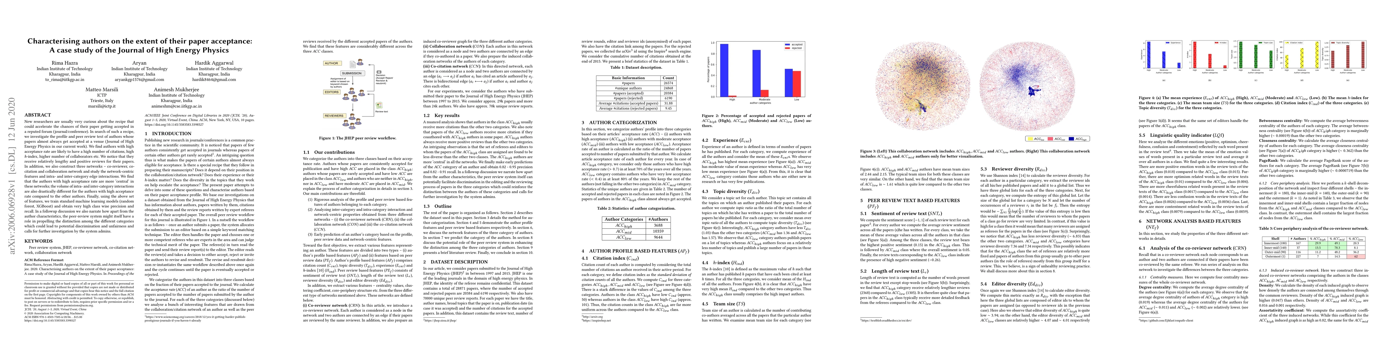 New researchers are usually very curious about the recipe that could accelerate the chances of their paper getting accepted in a reputed forum (journal/conference). In search of such a recipe, we investigate the profile and peer review text of authors whose papers almost always get accepted at a venue (Journal of High Energy Physics in our current work). We find authors with high acceptance rate are likely to have a high number of citations, high $h$-index, higher number of collaborators etc. We notice that they receive relatively lengthy and positive reviews for their papers. In addition, we also construct three networks -- co-reviewer, co-citation and collaboration network and study the network-centric features and intra- and inter-category edge interactions. We find that the authors with high acceptance rate are more `central' in these networks; the volume of intra- and inter-category interactions are also drastically different for the authors with high acceptance rate compared to the other authors. Finally, using the above set of features, we train standard machine learning models (random forest, XGBoost) and obtain very high class wise precision and recall. In a followup discussion we also narrate how apart from the author characteristics, the peer-review system might itself have a role in propelling the distinction among the different categories which could lead to potential discrimination and unfairness and calls for further investigation by the system admins.