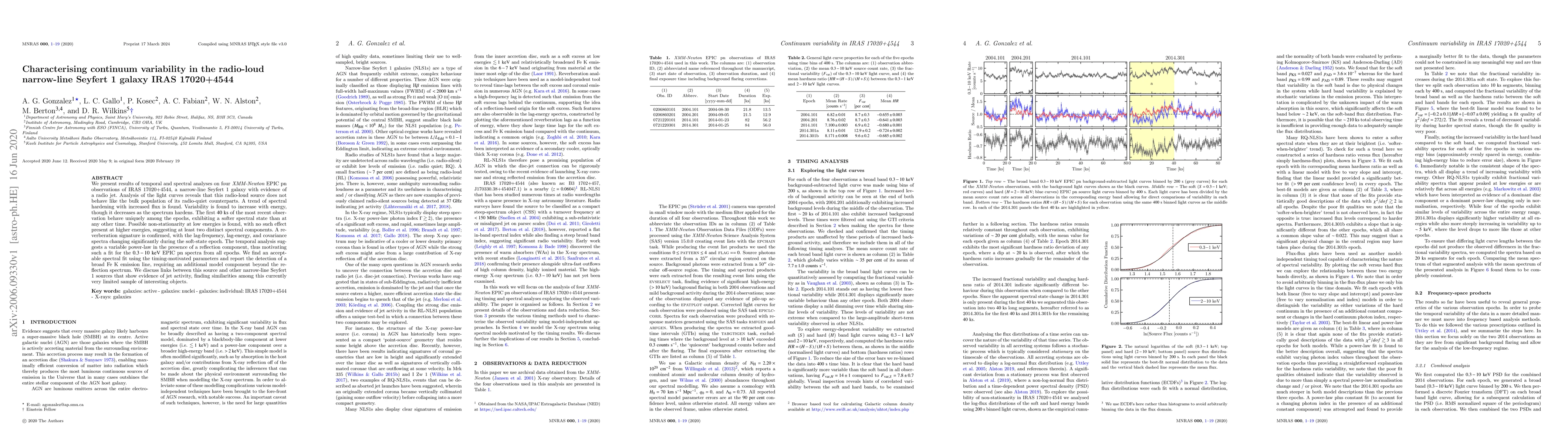 The study of radio-loud narrow-line Seyfert 1 galaxy IRAS 17020+4544 using four XMM-Newton observations reveals unique variability patterns, spectral hardening with increased flux, and energy-dependent variability. Distinct spectral components and a reverberation signature are identified, leading to a timing-motivated spectral model with a broad Fe K emission line detection. This source's behavior shares similarities with other jet-active narrow-line Seyfert 1 galaxies.
