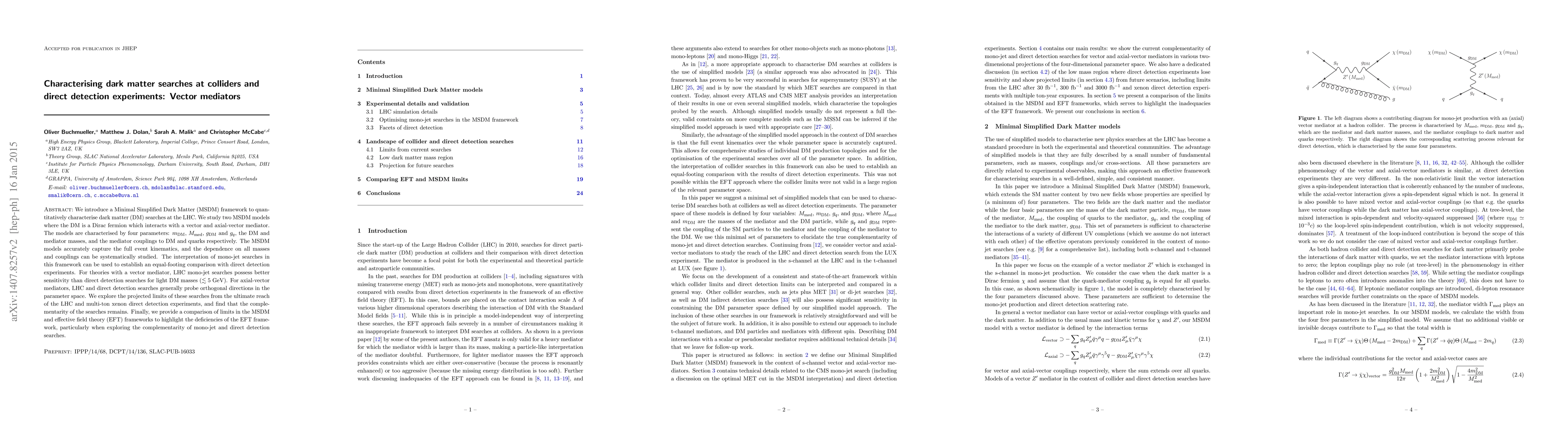 We introduce a Minimal Simplified Dark Matter (MSDM) framework to quantitatively characterise dark matter (DM) searches at the LHC. We study two MSDM models where the DM is a Dirac fermion which interacts with a vector and axial-vector mediator. The models are characterised by four parameters: the DM and mediator masses, and the mediator couplings to DM and quarks. The MSDM models accurately capture the full event kinematics, and the dependence on all masses and couplings can be systematically studied. The interpretation of mono-jet searches in this framework can be used to establish an equal-footing comparison with direct detection experiments. For theories with a vector mediator, LHC mono-jet searches possess better sensitivity than direct detection searches for light DM masses (less than 5 GeV). For axial-vector mediators, LHC and direct detection searches generally probe orthogonal directions in the parameter space. We explore the projected limits of these searches from the ultimate reach of the LHC and multi-ton xenon direct detection experiments, and find that the complementarity of the searches remains. Finally, we provide a comparison of limits in the MSDM and effective field theory (EFT) frameworks to highlight the deficiencies of the EFT framework, particularly when exploring the complementarity of mono-jet and direct detection searches.