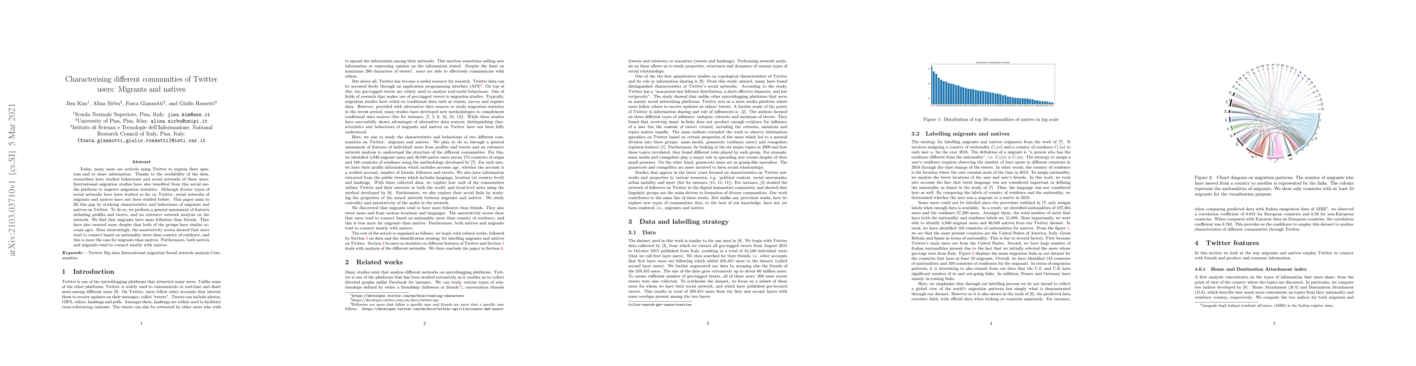 This paper characterizes the social networks of Twitter users, focusing on migrants and natives, revealing that migrants have more followers than friends and tweet more frequently. Network analysis shows that users connect more based on nationality than residence, with migrants showing stronger ties to their nationality.