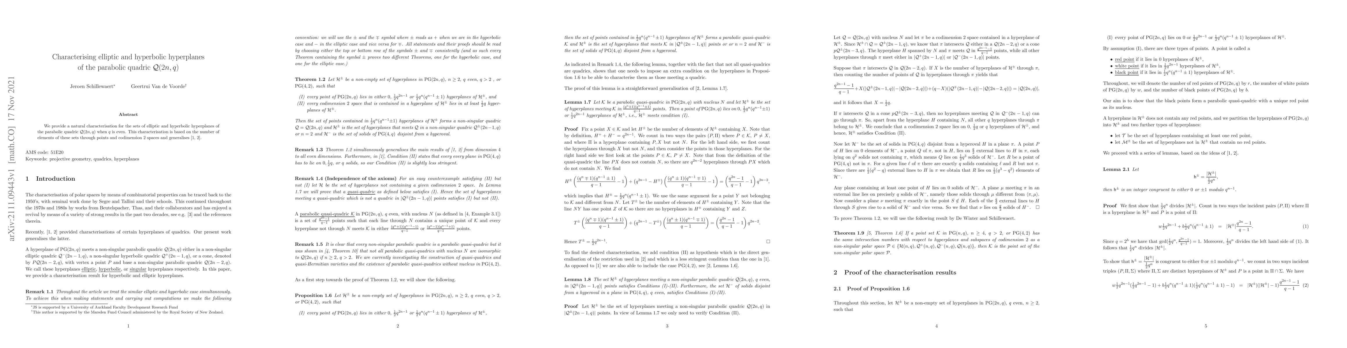 We provide a natural characterisation for the sets of elliptic and hyperbolic hyperplanes of the parabolic quadric Q(2n,q) when q is even. This characterisation is based on the number of elements of these sets through points and codimension 2 spaces and generalises [S. Barwick, A. Hui, and W-A. Jackson. Characterising elliptic solids of Q(4,q), q even. Discrete Math., 343 (6) (2020), 111857] and [S. Barwick, A. Hui, W-A. Jackson, and J. Schillewaert. Characterising hyperbolic solids of Q(4,q), q even. Des. Codes Cryptogr., 88 (1) (2020), 33--39.].