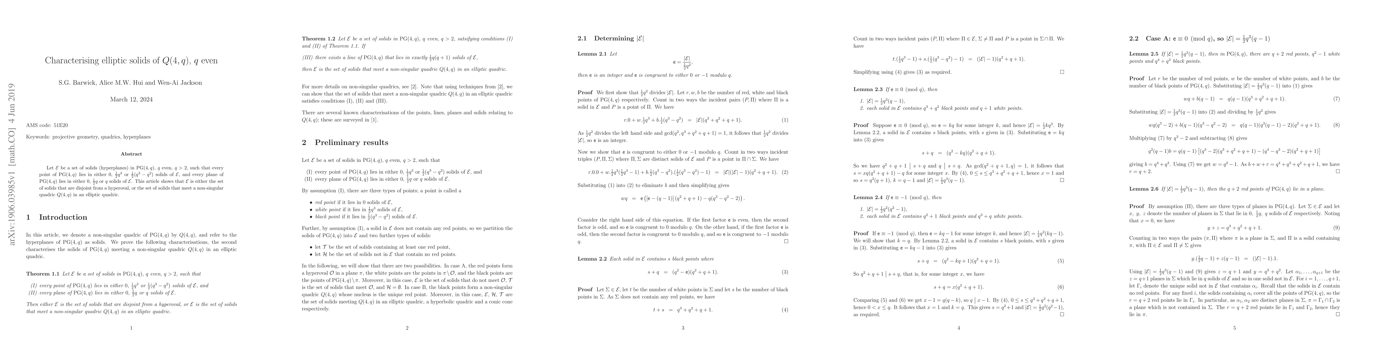 This paper characterizes elliptic solids in $PG(4,q)$ for even $q$, showing that a specific set $E$ of hyperplanes either avoids hyperovals entirely or intersects a non-singular quadric $Q(4,q)$ in an elliptic quadric. The study reveals the distribution of points and planes within these solids.