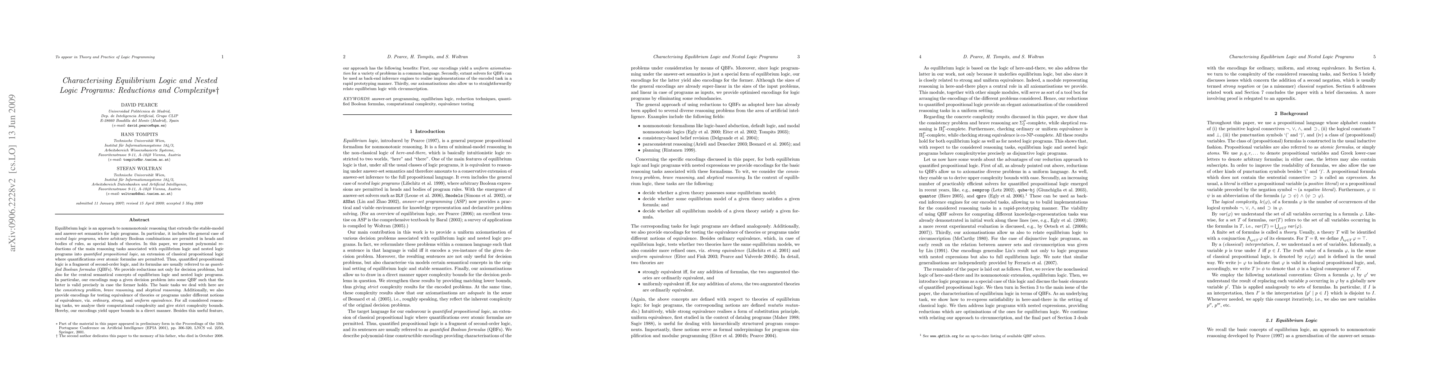This paper presents polynomial reductions of key reasoning tasks in equilibrium logic and nested logic programs into quantified propositional logic, focusing on consistency, brave and skeptical reasoning, and equivalence tests. It analyzes the computational complexity of these tasks and provides strict complexity bounds.