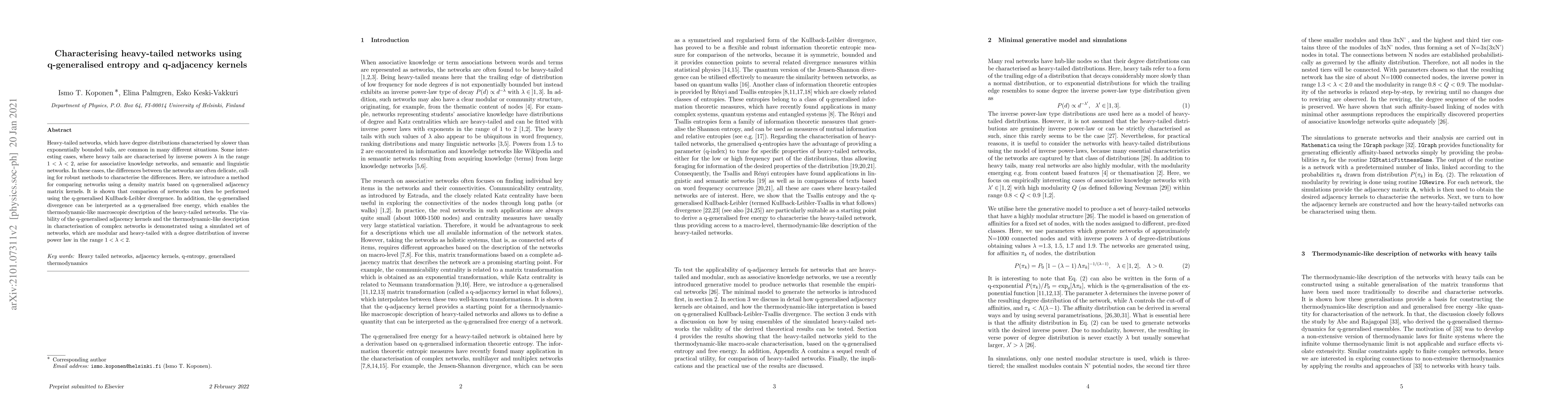 Heavy-tailed networks, which have degree distributions characterised by slower than exponentially bounded tails, are common in many different situations. Some interesting cases, where heavy tails are characterised by inverse powers $\lambda$ in the range $1<\lambda<2,$ arise for associative knowledge networks, and semantic and linguistic networks. In these cases, the differences between the networks are often delicate, calling for robust methods to characterise the differences. Here, we introduce a method for comparing networks using a density matrix based on q-generalised adjacency matrix kernels. It is shown that comparison of networks can then be performed using the q-generalised Kullback-Leibler divergence. In addition, the q-generalised divergence can be interpreted as a q-generalised free energy, which enables the thermodynamic-like macroscopic description of the heavy-tailed networks. The viability of the q-generalised adjacency kernels and the thermodynamic-like description in characterisation of complex networks is demonstrated using a simulated set of networks, which are modular and heavy-tailed with a degree distribution of inverse power law in the range $1<\lambda<2$.