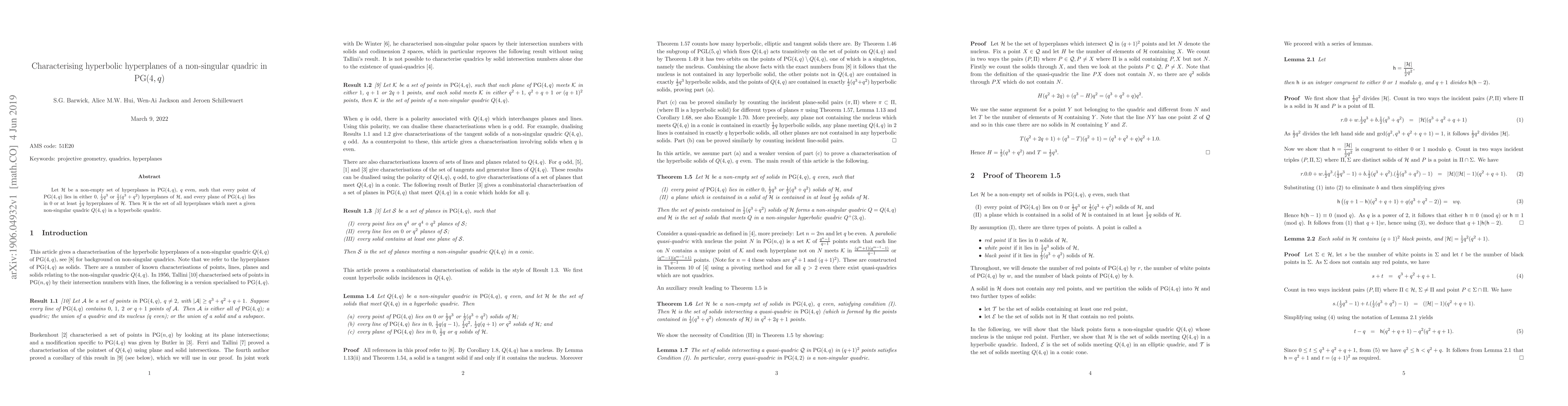 This paper characterizes the set of hyperbolic hyperplanes in $PG(4,q)$ that intersect a given non-singular quadric $Q(4,q)$ in a hyperbolic quadric, under the condition that each point lies in a specific number of hyperplanes and each plane intersects a minimum number of hyperplanes. The result is that $H$ consists of all hyperplanes meeting the quadric in a hyperbolic quadric.