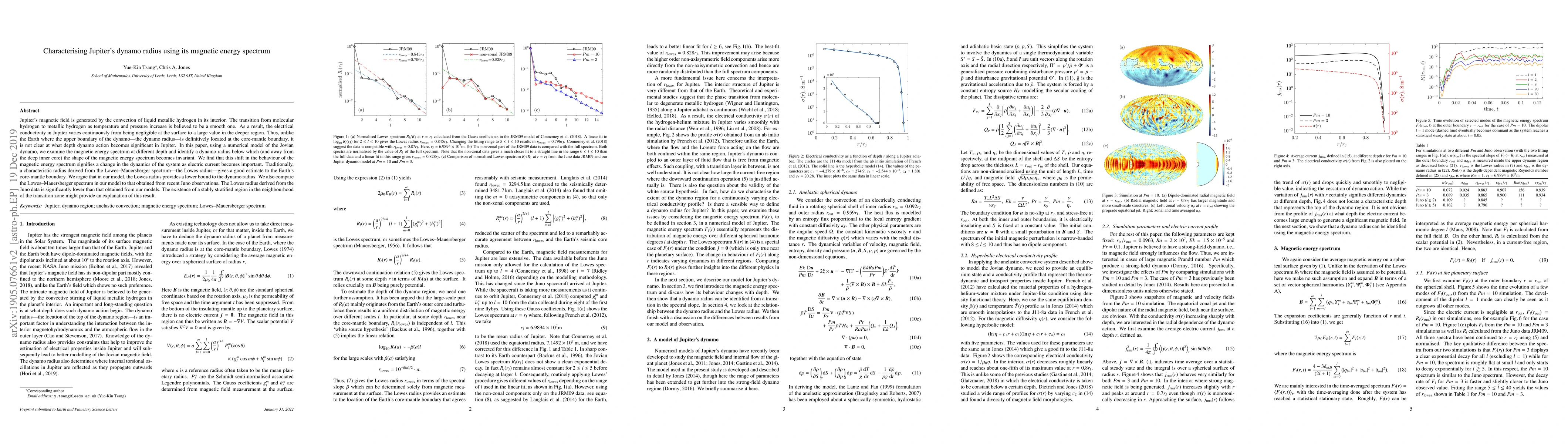 Jupiter's magnetic field is generated by the convection of liquid metallic hydrogen in its interior. The transition from molecular hydrogen to metallic hydrogen as temperature and pressure increase is believed to be a smooth one. As a result, the electrical conductivity in Jupiter varies continuously from being negligible at the surface to a large value in the deeper region. Thus, unlike the Earth where the upper boundary of the dynamo---the dynamo radius---is definitively located at the core-mantle boundary, it is not clear at what depth dynamo action becomes significant in Jupiter. In this paper, using a numerical model of the Jovian dynamo, we examine the magnetic energy spectrum at different depth and identify a dynamo radius below which (and away from the deep inner core) the shape of the magnetic energy spectrum becomes invariant. We find that this shift in the behaviour of the magnetic energy spectrum signifies a change in the dynamics of the system as electric current becomes important. Traditionally, a characteristic radius derived from the Lowes--Mauersberger spectrum---the Lowes radius---gives a good estimate to the Earth's core-mantle boundary. We argue that in our model, the Lowes radius provides a lower bound to the dynamo radius. We also compare the Lowes--Mauersberger spectrum in our model to that obtained from recent Juno observations. The Lowes radius derived from the Juno data is significantly lower than that obtained from our models. The existence of a stably stratified region in the neighbourhood of the transition zone might provide an explanation of this result.