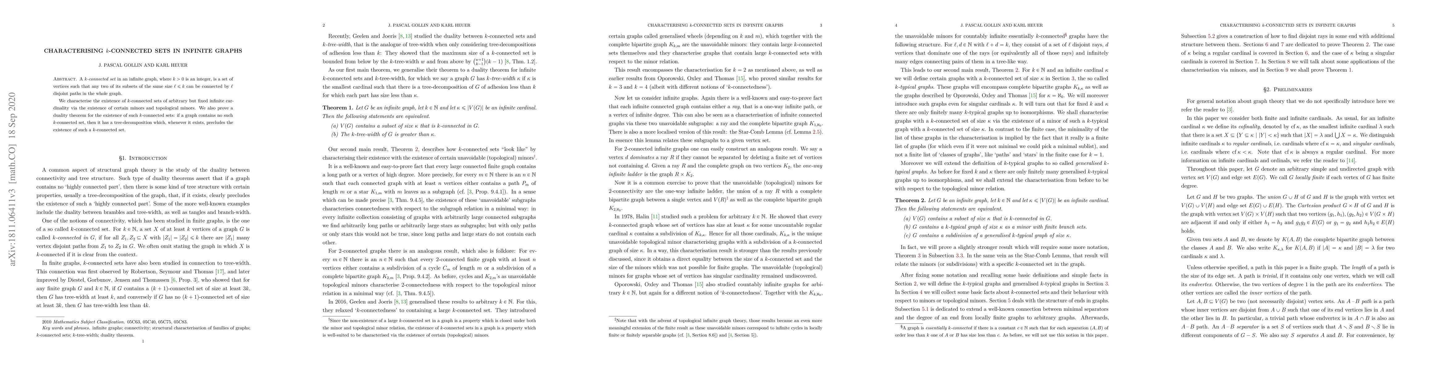 A $k$-connected set in an infinite graph, where $k > 0$ is an integer, is a set of vertices such that any two of its subsets of the same size $\ell \leq k$ can be connected by $\ell$ disjoint paths in the whole graph. We characterise the existence of $k$-connected sets of arbitrary but fixed infinite cardinality via the existence of certain minors and topological minors. We also prove a duality theorem for the existence of such $k$-connected sets: if a graph contains no such $k$-connected set, then it has a tree-decomposition which, whenever it exists, precludes the existence of such a $k$-connected set.