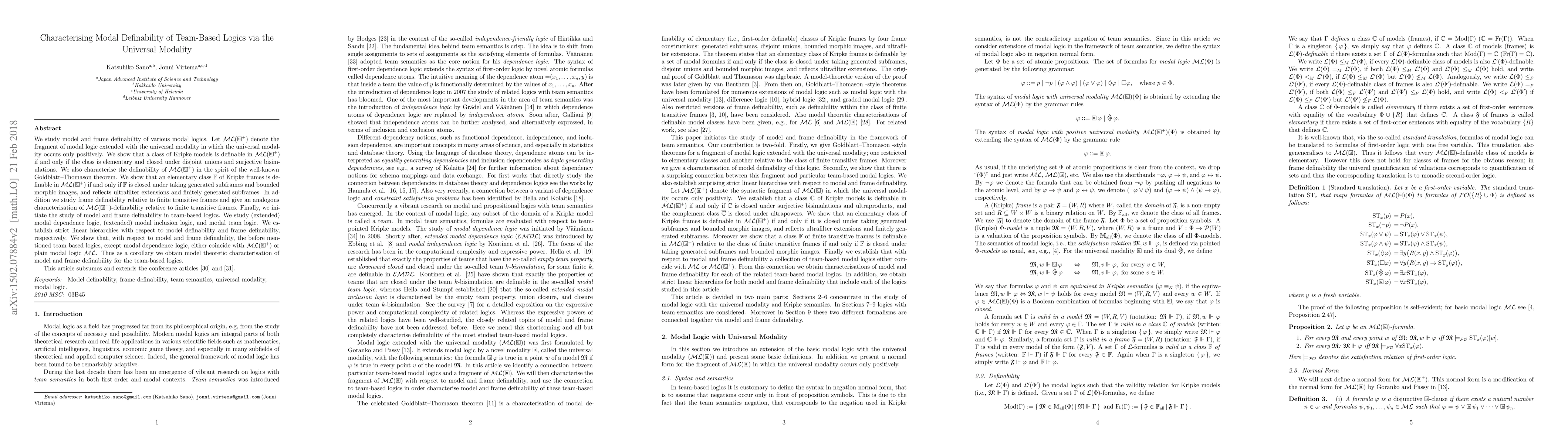 We study model and frame definability of various modal logics. Let ML(A+) denote the fragment of modal logic extended with the universal modality in which the universal modality occurs only positively. We show that a class of Kripke models is definable in ML(A+) if and only if the class is elementary and closed under disjoint unions and surjective bisimulations. We also characterise the definability of ML(A+) in the spirit of the well-known Goldblatt--Thomason theorem. We show that an elementary class F of Kripke frames is definable in ML(A+) if and only if F is closed under taking generated subframes and bounded morphic images, and reflects ultrafilter extensions and finitely generated subframes. In addition we study frame definability relative to finite transitive frames and give an analogous characterisation of ML(A+)-definability relative to finite transitive frames. Finally, we initiate the study of model and frame definability in team-based logics. We study (extended) modal dependence logic, (extended) modal inclusion logic, and modal team logic. We establish strict linear hierarchies with respect to model definability and frame definability, respectively. We show that, with respect to model and frame definability, the before mentioned team-based logics, except modal dependence logic, either coincide with ML(A+) or plain modal logic ML. Thus as a corollary we obtain model theoretic characterisation of model and frame definability for the team-based logics.