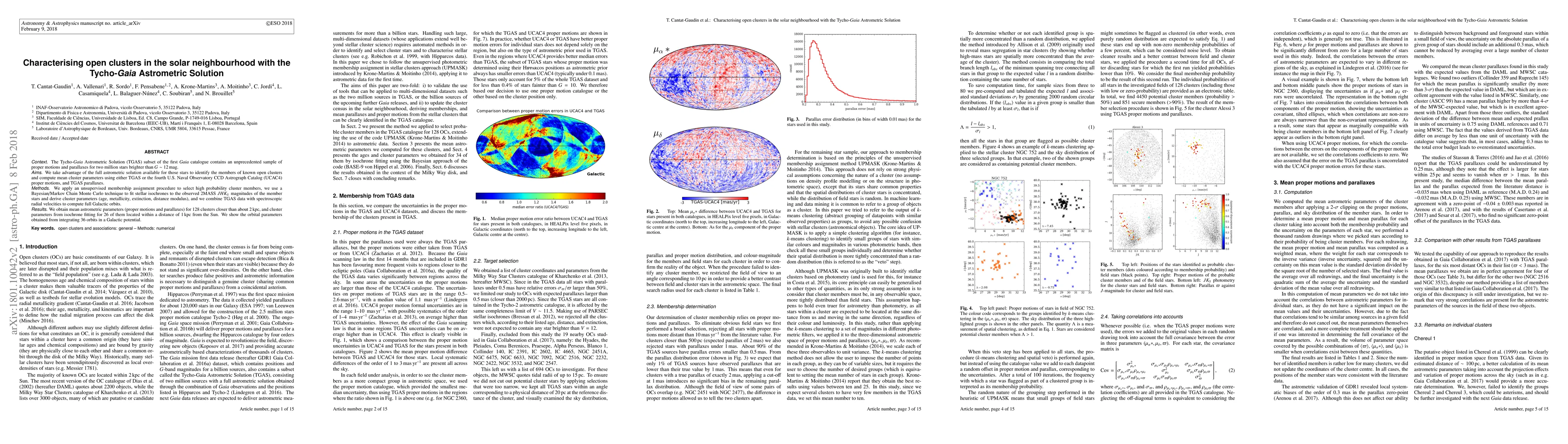 This paper characterizes 128 open clusters within 2 kpc of the Sun using the Tycho-Gaia Astrometric Solution (TGAS) data, identifying members and computing mean parameters, including age and metallicity, through Bayesian fitting of stellar isochrones. It also integrates 36 orbits to determine full Galactic orbits for the clusters.